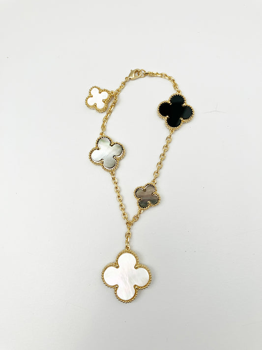 Mixed Mother of Pearl and Onyx Quatrefoil Motif Charm Bracelet in Gold
