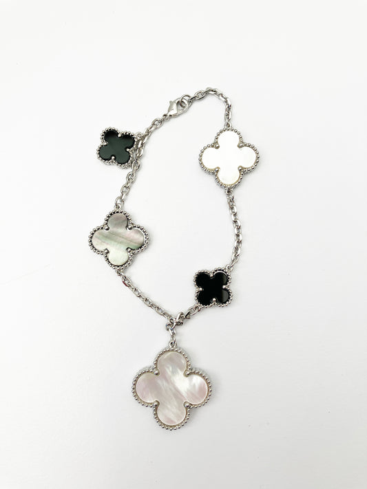Mixed Mother of Pearl and Onyx Quatrefoil Motif Charm Bracelet in Silver