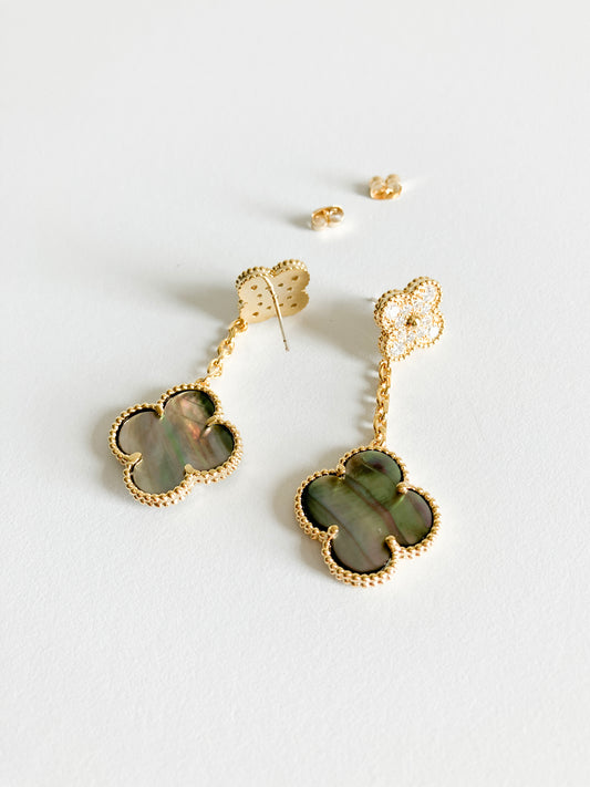 Cubic Zirconia and Grey Mother of Pearl Quatrefoil Double Drop Earrings in Gold