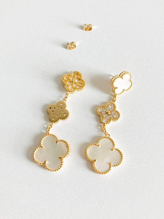 Cubic Zirconia and Mother of Pearl Quatrefoil Triple Drop Earrings in Gold