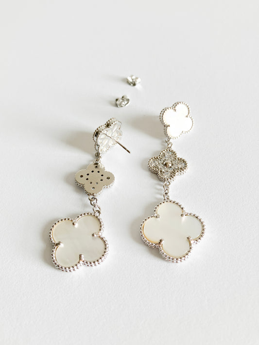 Cubic Zirconia and Mother of Pearl Quatrefoil Triple Drop Earrings in Silver