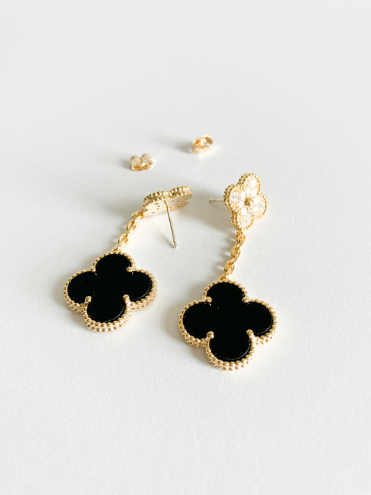 Cubic Zirconia and Onyx Quatrefoil Double Drop Earrings in Gold