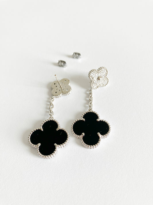 Cubic Zirconia and Onyx Quatrefoil Double Drop Earrings in Silver