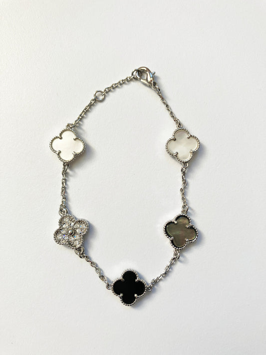 Adjustable 7.5" Onyx, Cubic Zirconium, Mother of Pearl Quatrefoil Bracelet