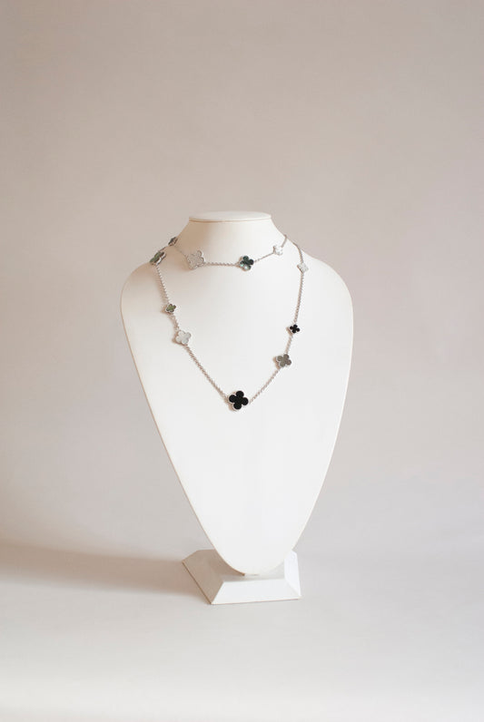 Mixed Size Onyx and White and Gray Mother of Pearl Quatrefoil Silver Plated Necklace