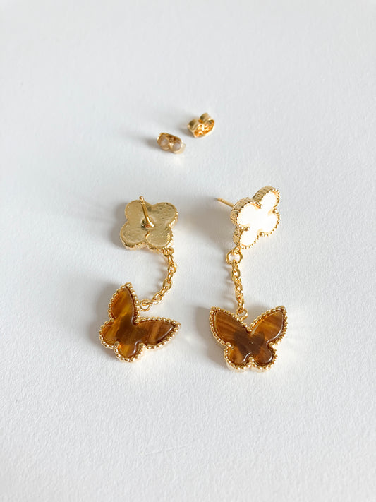 Mother of Pearl Quatrefoil and Amber Butterfly Drop Earrings in Gold