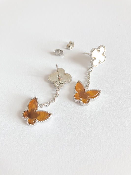 Mother of Pearl Quatrefoil and Amber Butterfly Drop Earrings in Silver