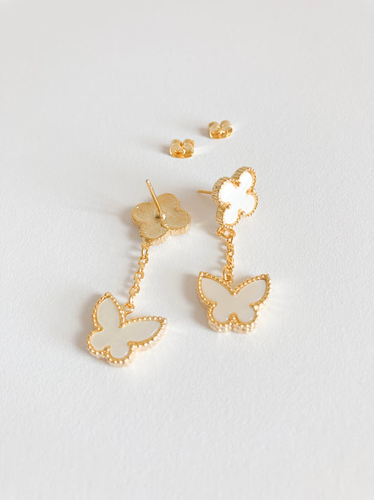 Mother of Pearl Quatrefoil and Butterfly Drop Earrings in Gold