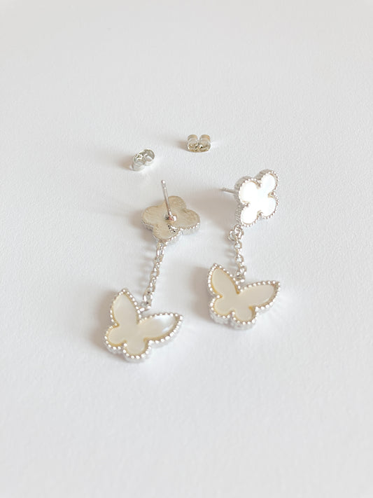 Mother of Pearl Quatrefoil and Butterfly Drop Earrings in Silver