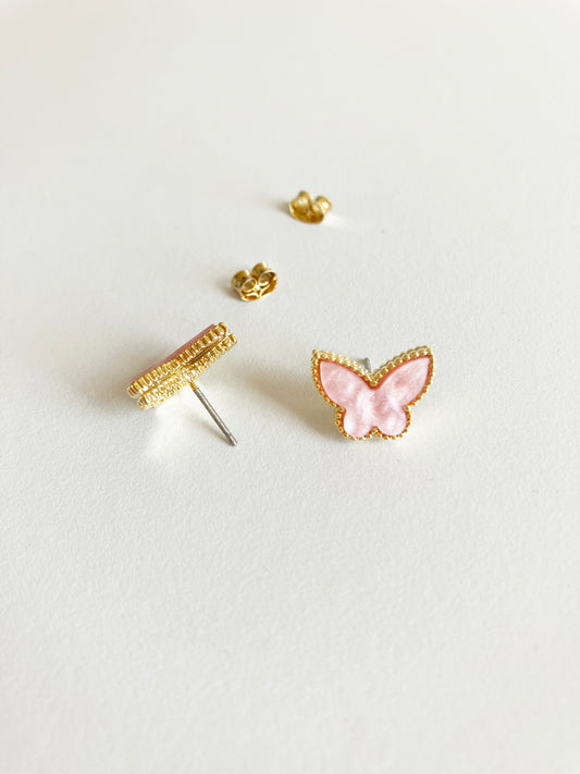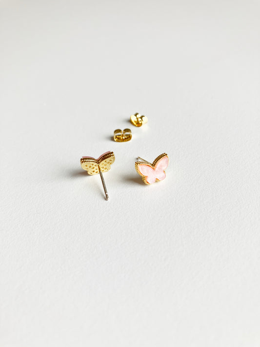 Mini Pink Mother of Pearl Butterfly Earrings in Gold