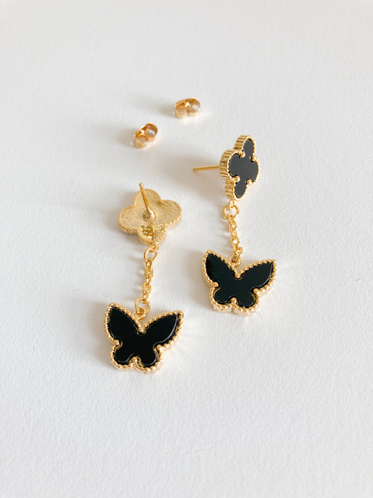 Onyx Quatrefoil and Butterfly Drop Earrings in Gold