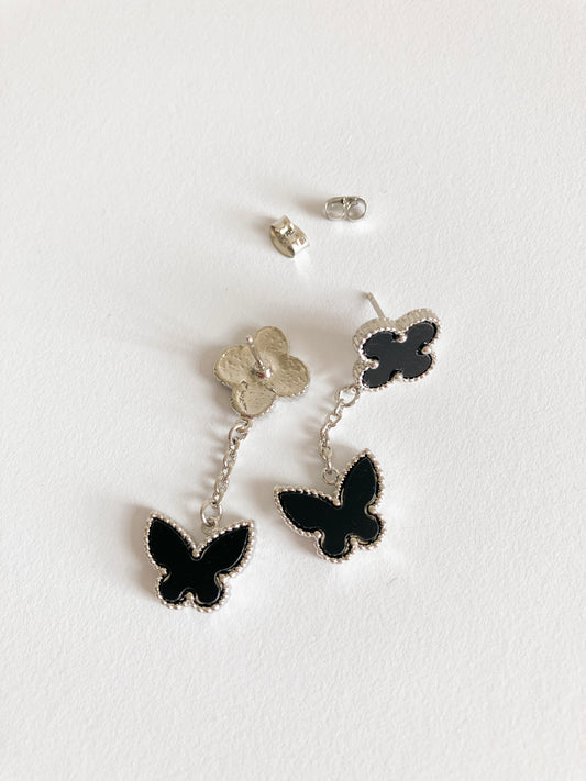 Onyx Quatrefoil and Butterfly Drop Earrings in Silver