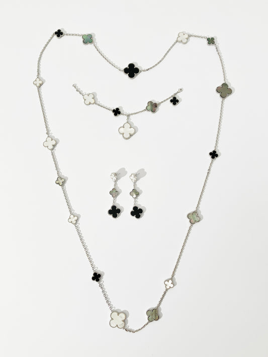 Mixed Mother of Pearl and Onyx Quatrefoil Motif Parure in Silver