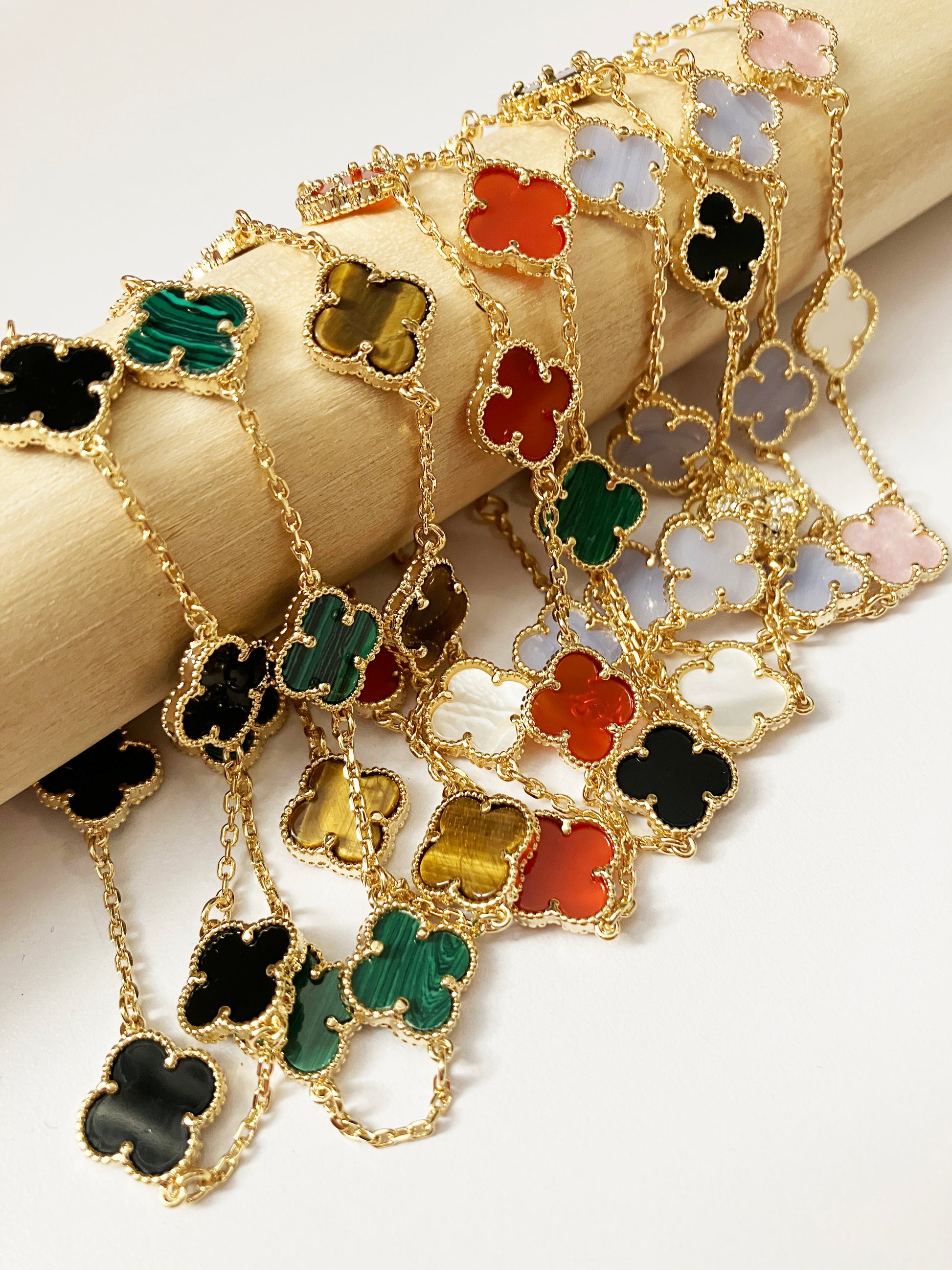 Adjustable 7.5" small quatrefoil motif bracelet with 5 carnelian stones set in gold plated saw non-tarnishing surgical steel—mix and match your favorite stones!