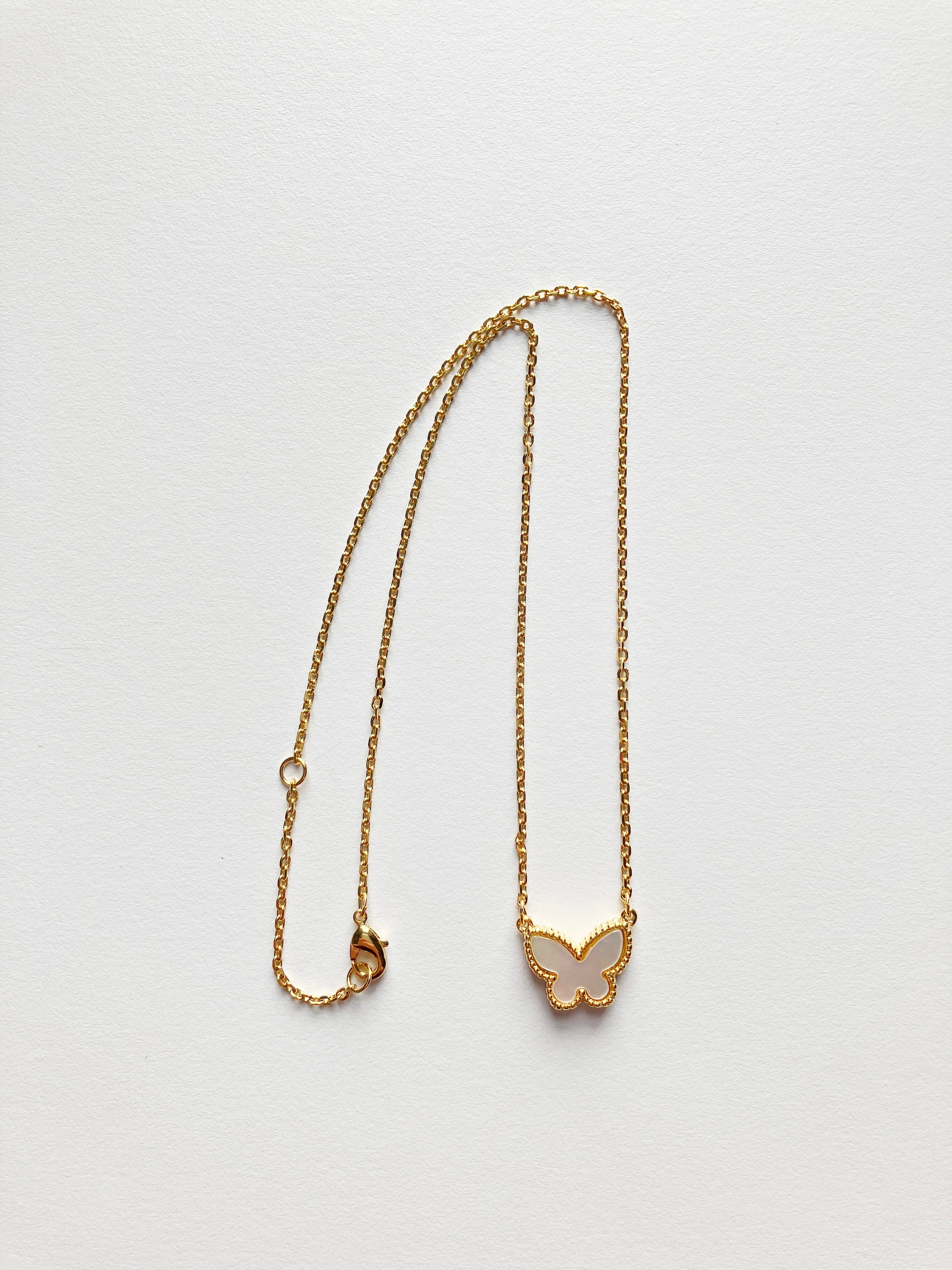 Butterfly motif pendant with mother of pearl stone set in gold plated non-tarnishing surgical steel on adjustable 16” gold plated non-tarnishing surgical steel chain with a lobster clasp.
