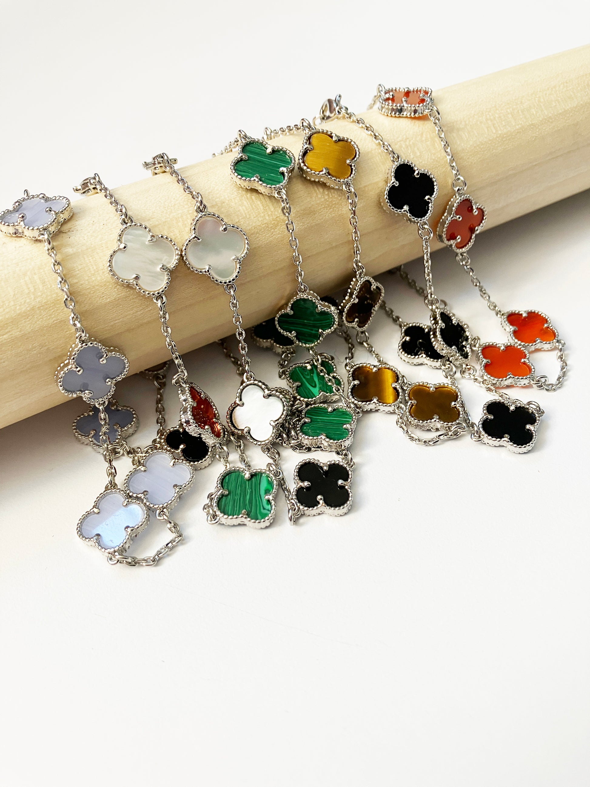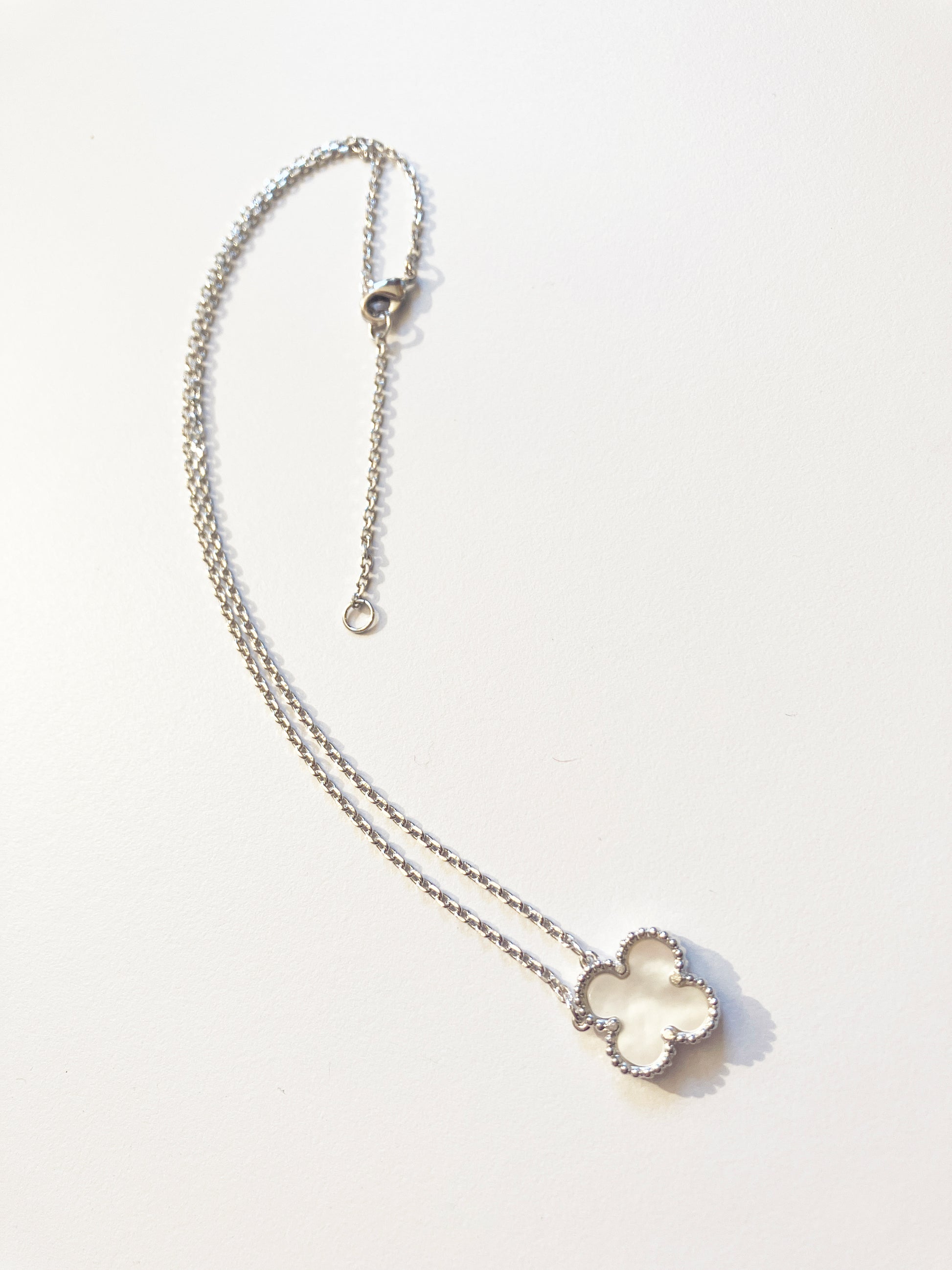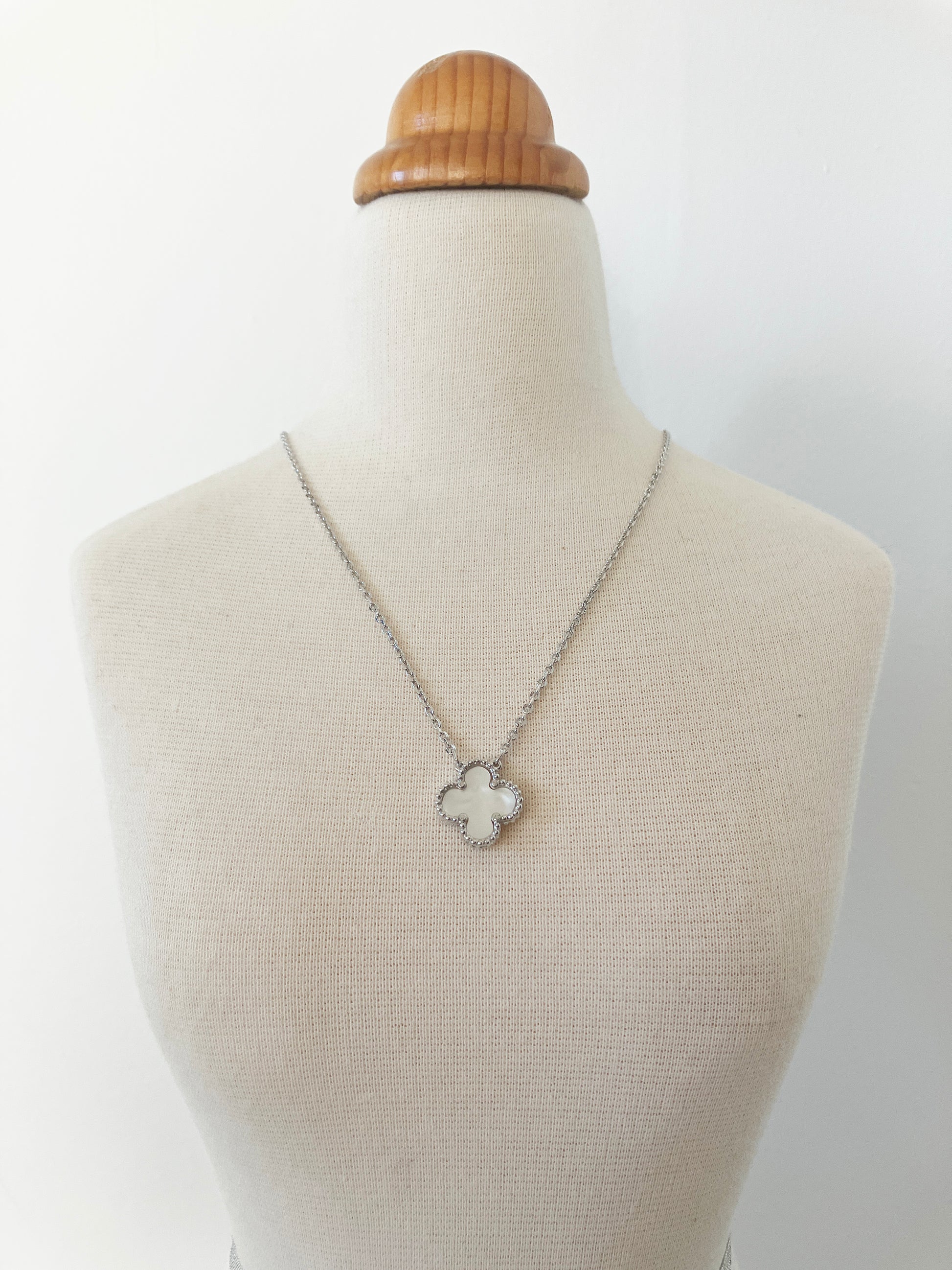 Quatrefoil motif pendant with mother of pearl stone set in silver plated non-tarnishing surgical steel on 14”-15” silver plated non-tarnishing surgical steel chain with a lobster clasp.