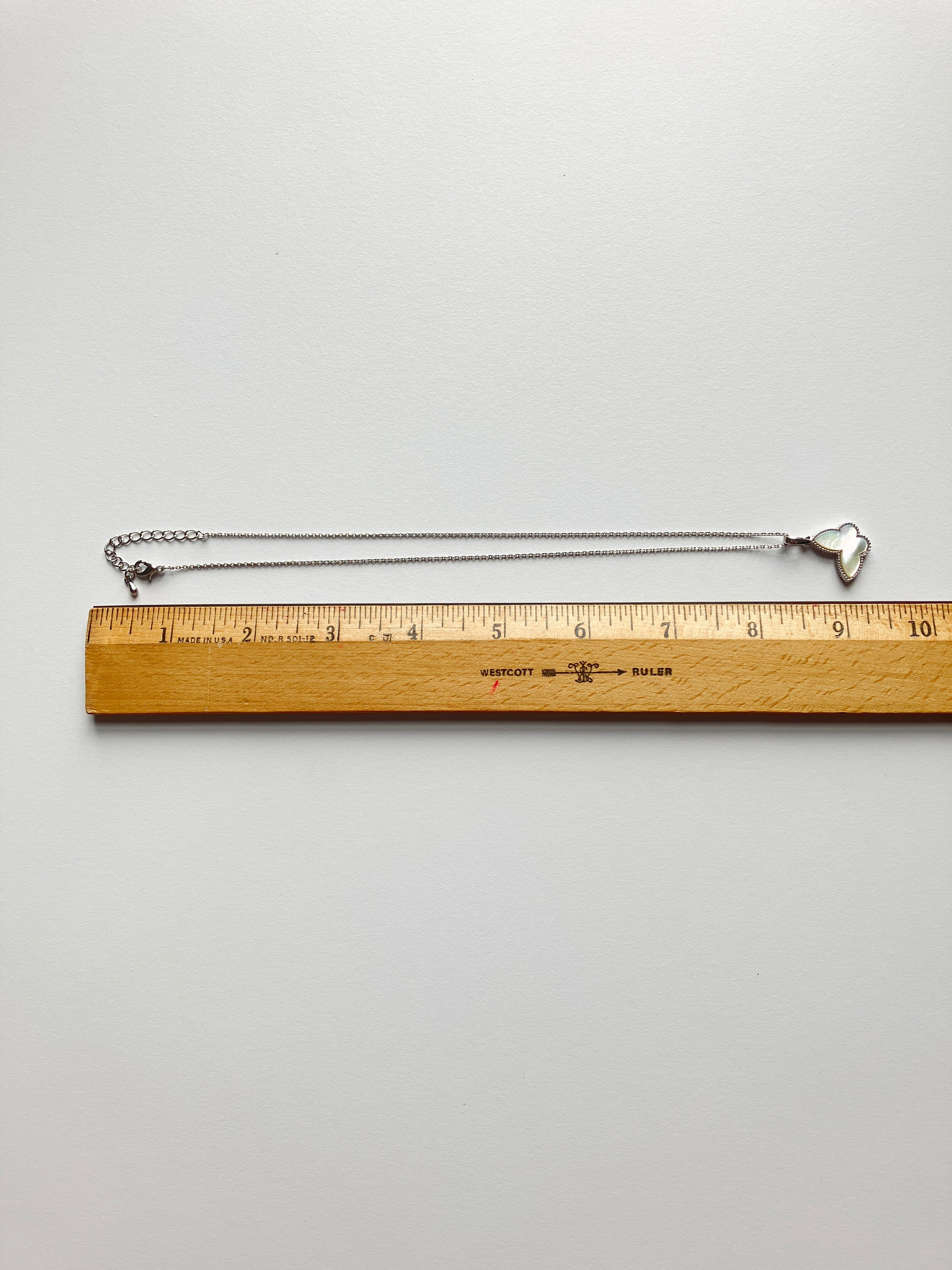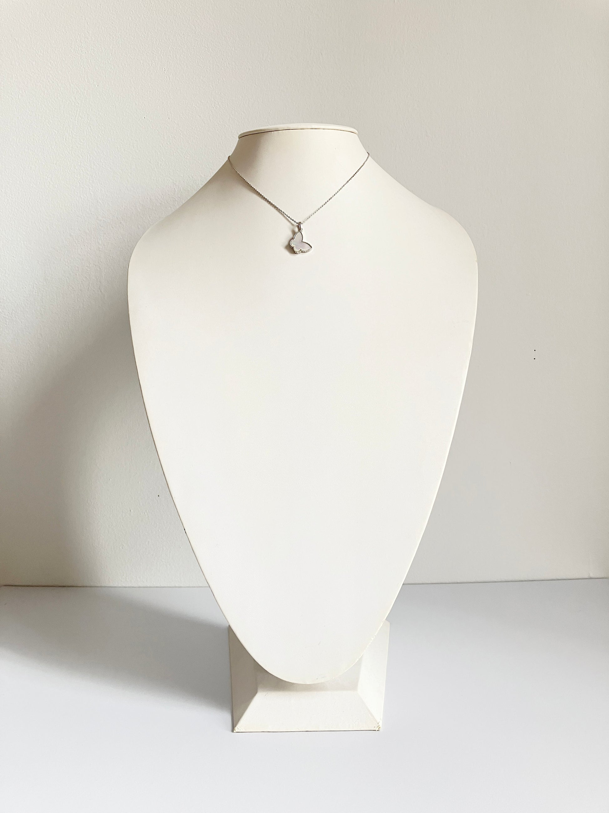 Butterfly motif charm pendant with mother of pearl stone set in silver plated non-tarnishing surgical steel on adjustable 18” silver plated non-tarnishing surgical steel chain with a lobster clasp.