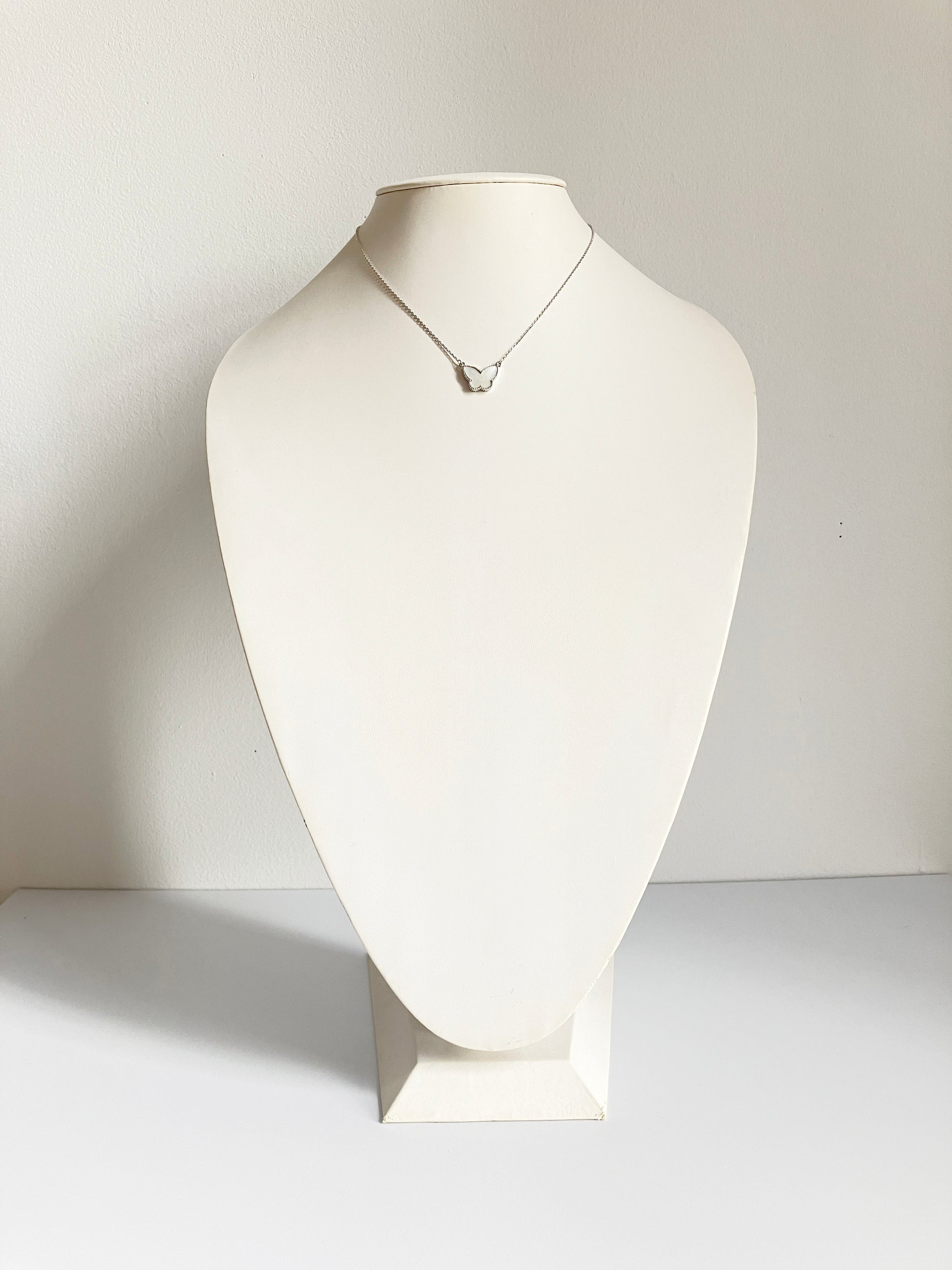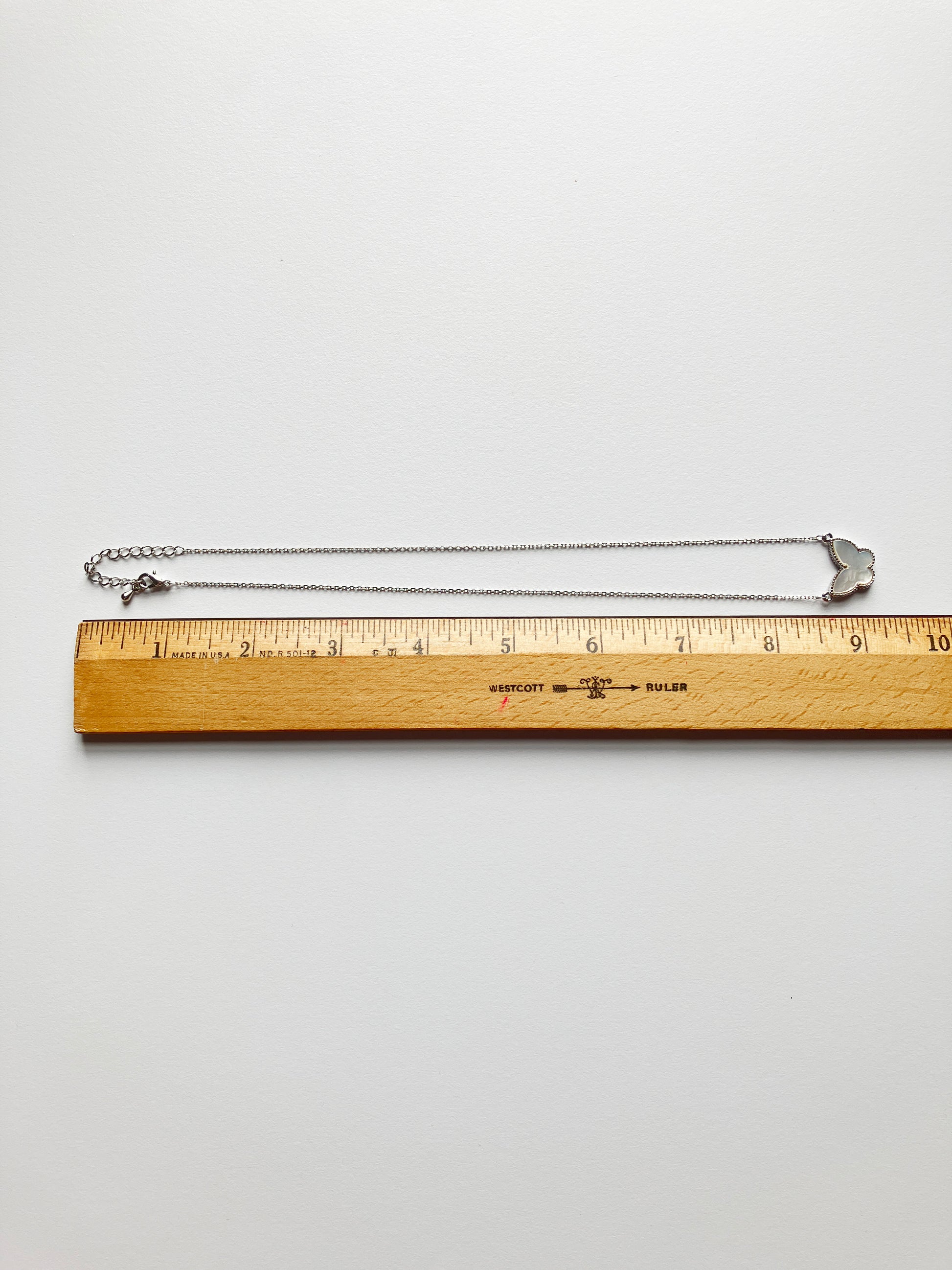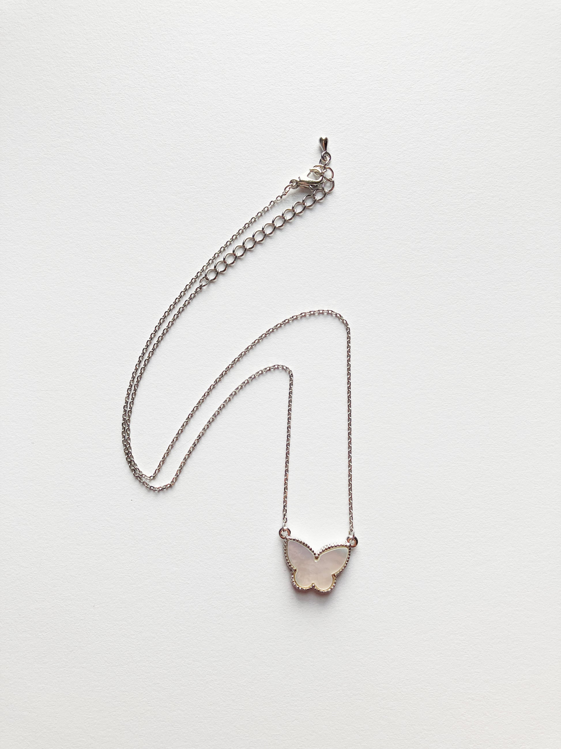 Butterfly motif pendant with mother of pearl stone set in silver plated non-tarnishing surgical steel on adjustable 18” silver plated non-tarnishing surgical steel chain with a lobster clasp.