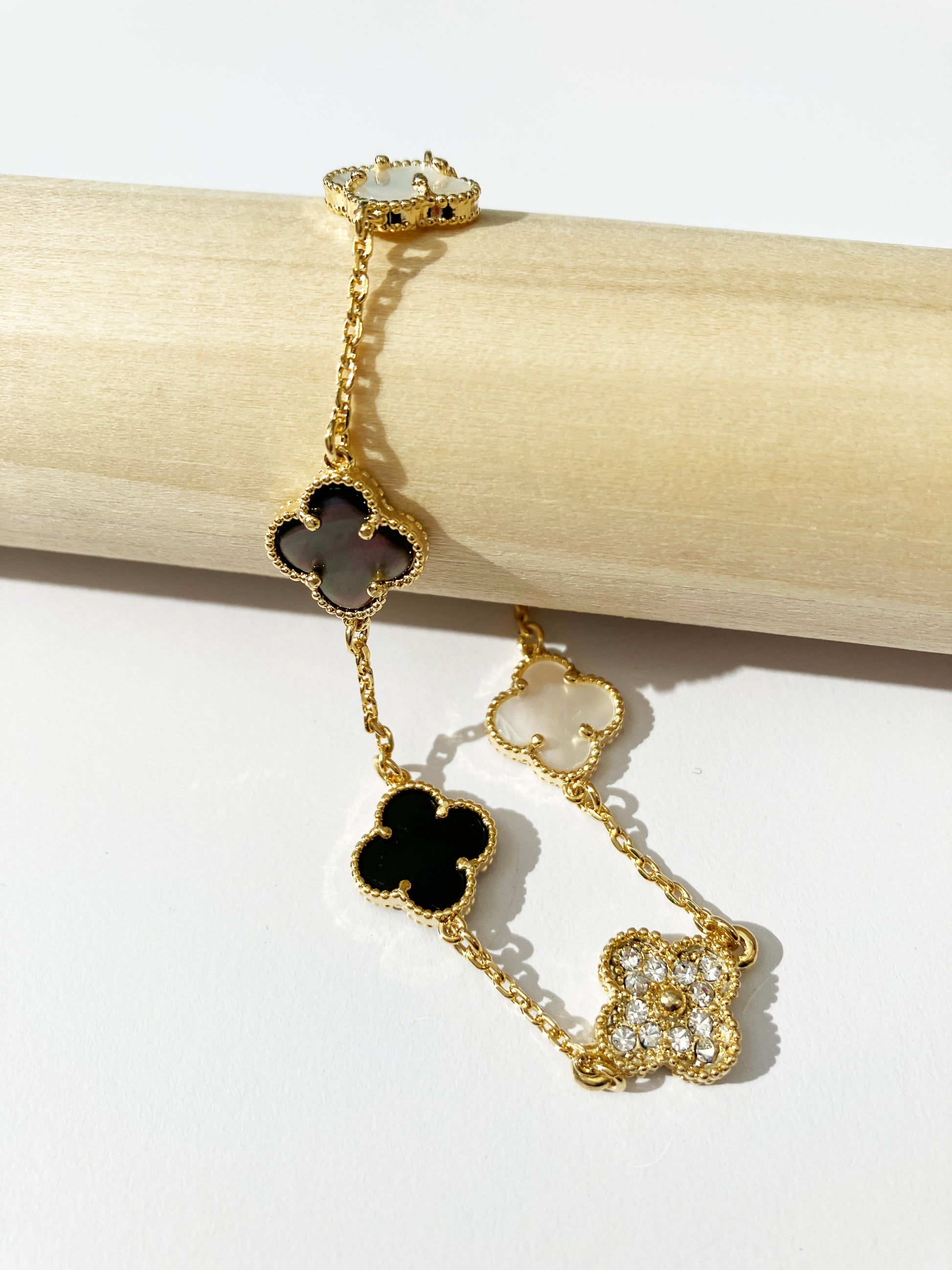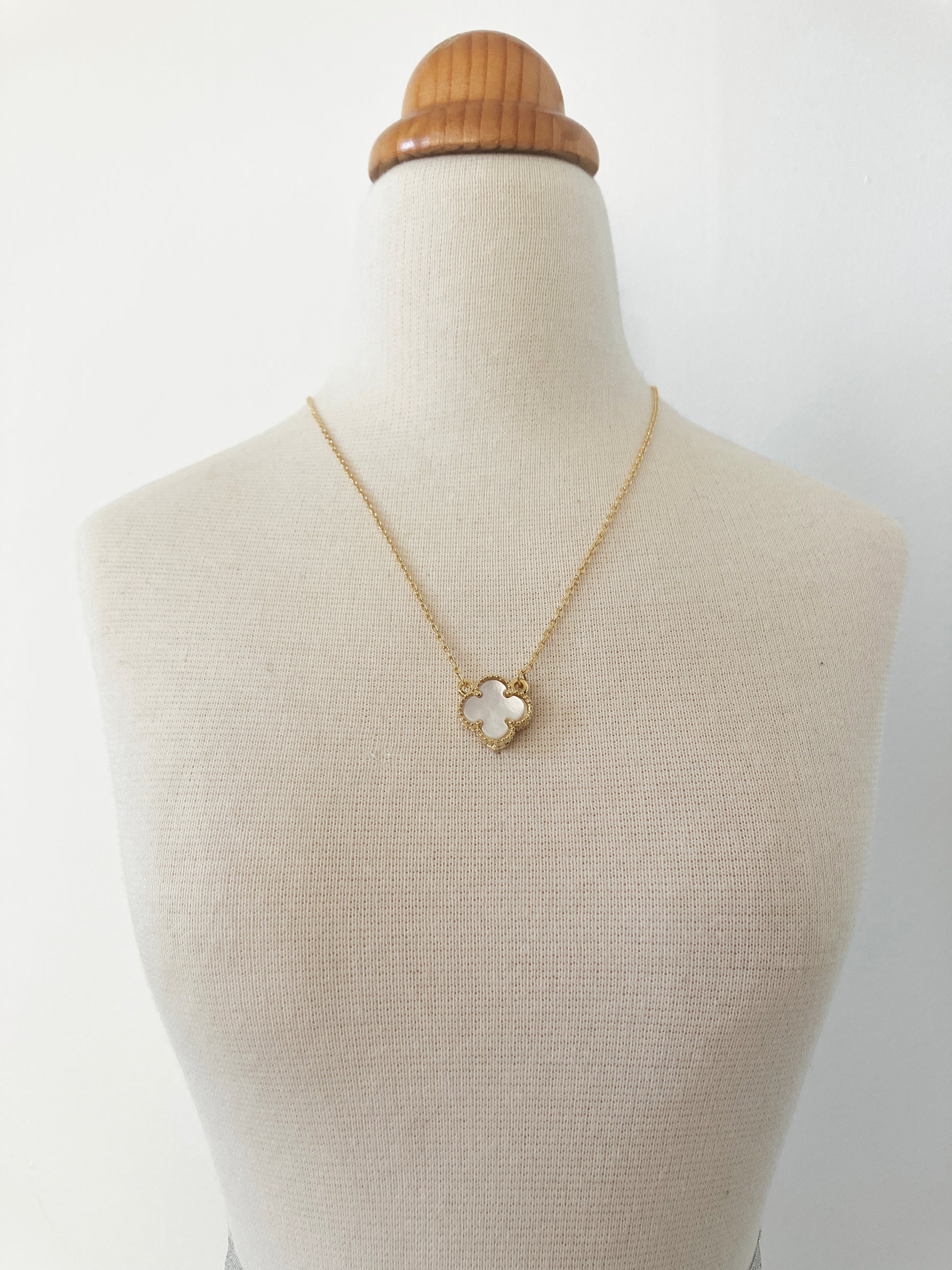 Quatrefoil motif pendant with mother of pearl stone set in gold plated non-tarnishing surgical steel on 15”-16” gold plated non-tarnishing surgical steel chain with a lobster clasp.