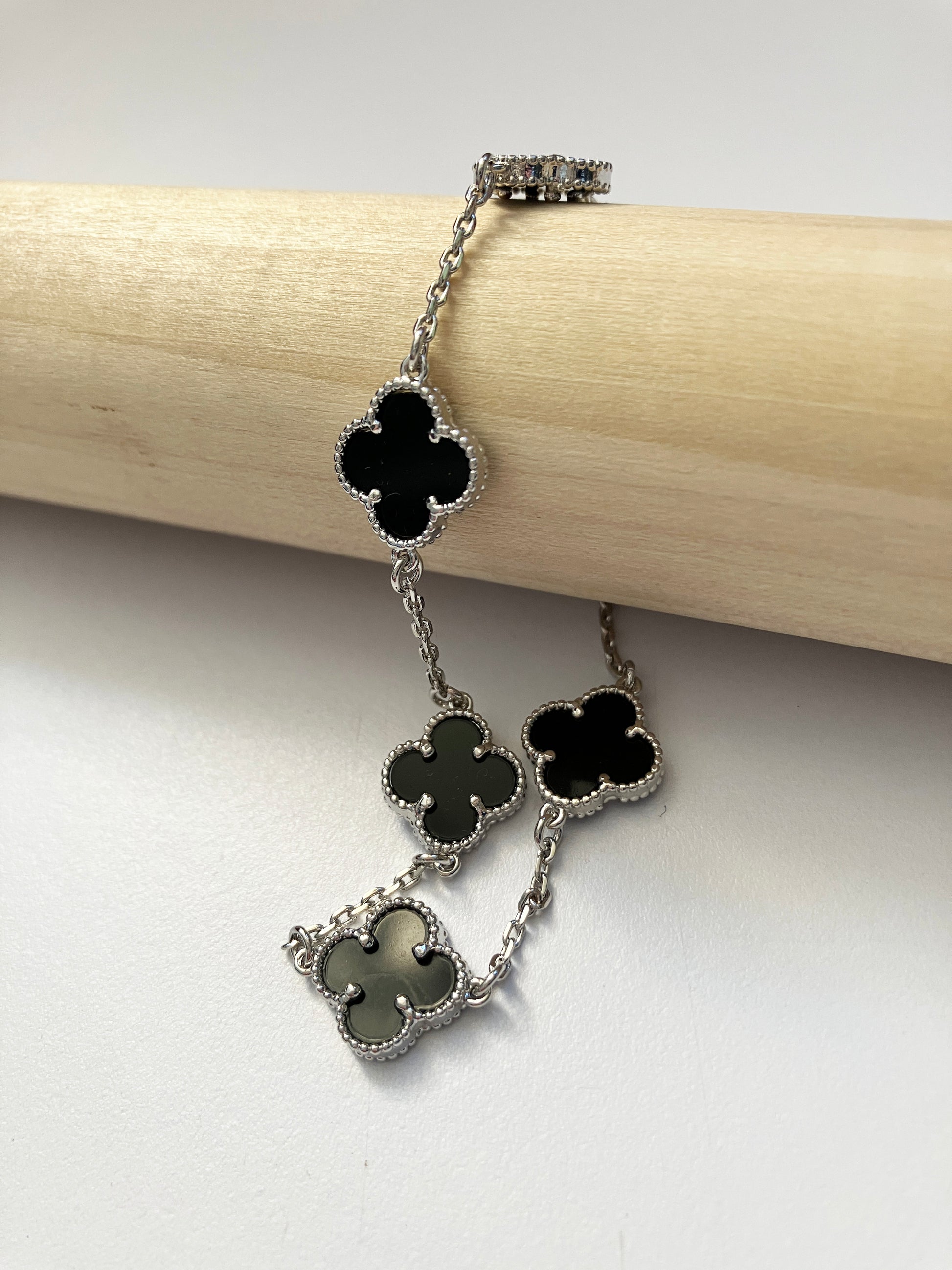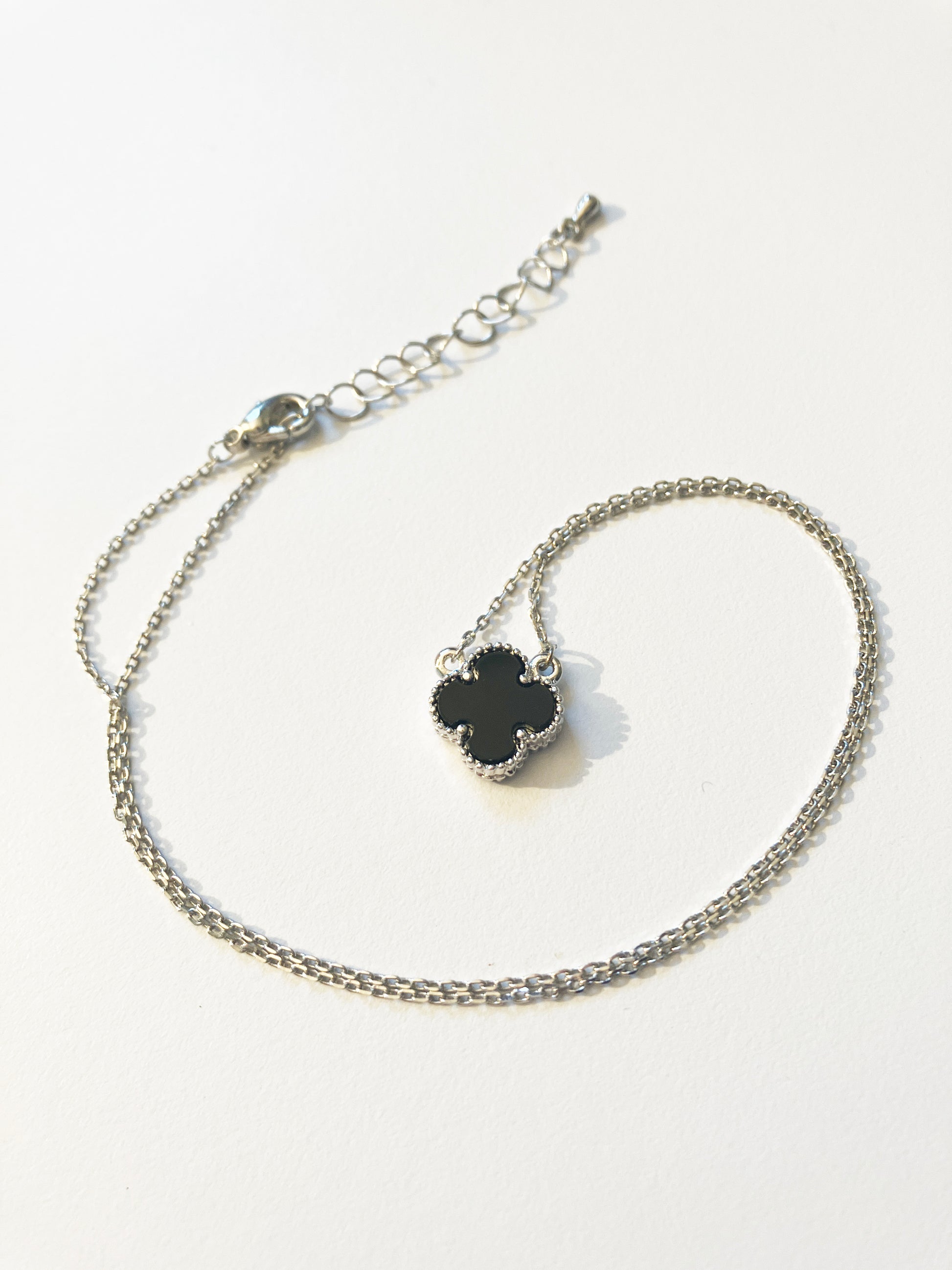 Quatrefoil motif pendant with quatrefoil shaped onyx stone set in silver plated non-tarnishing surgical steel on 15”-16” silver plated non-tarnishing surgical steel chain with a lobster clasp.