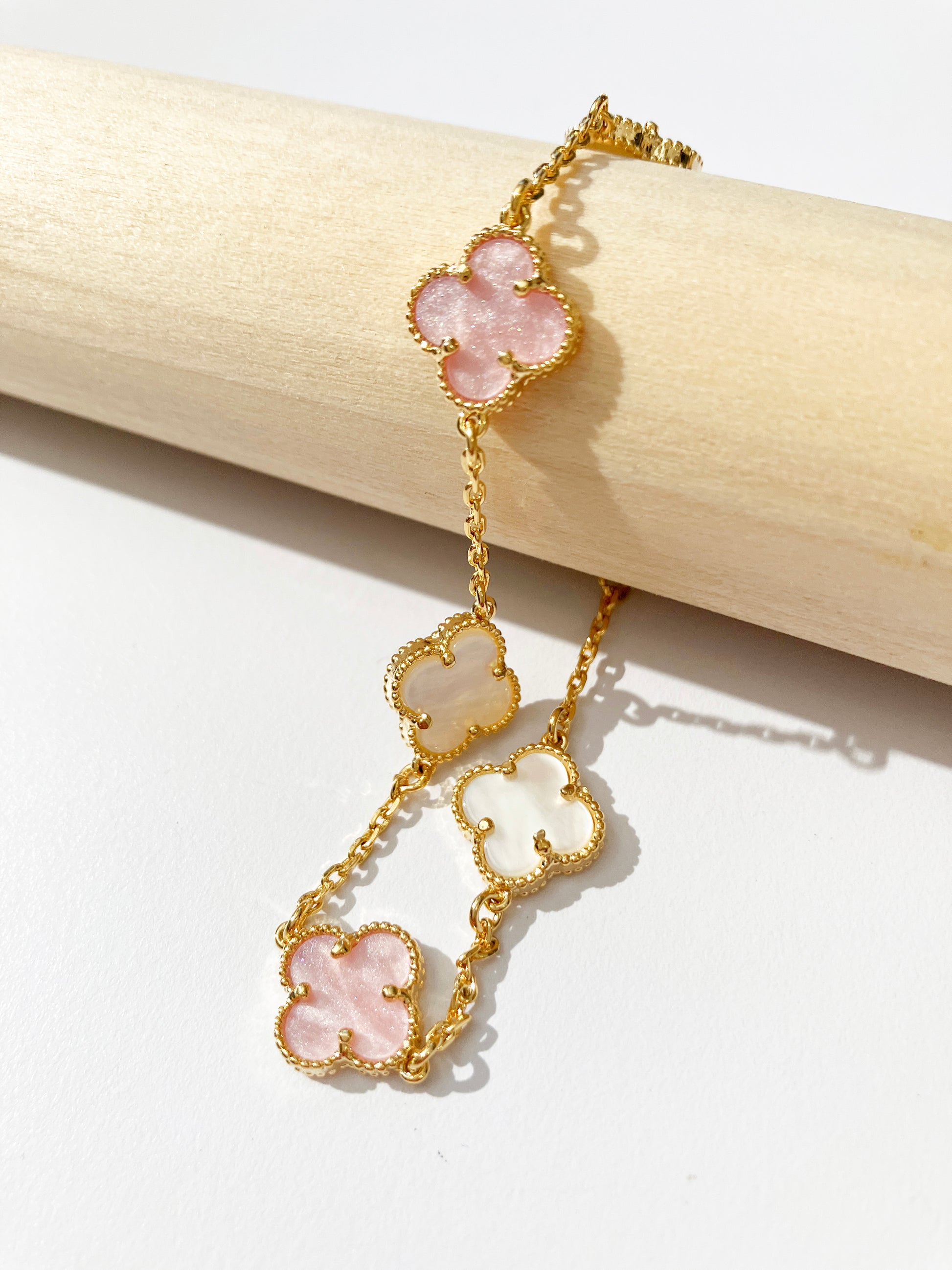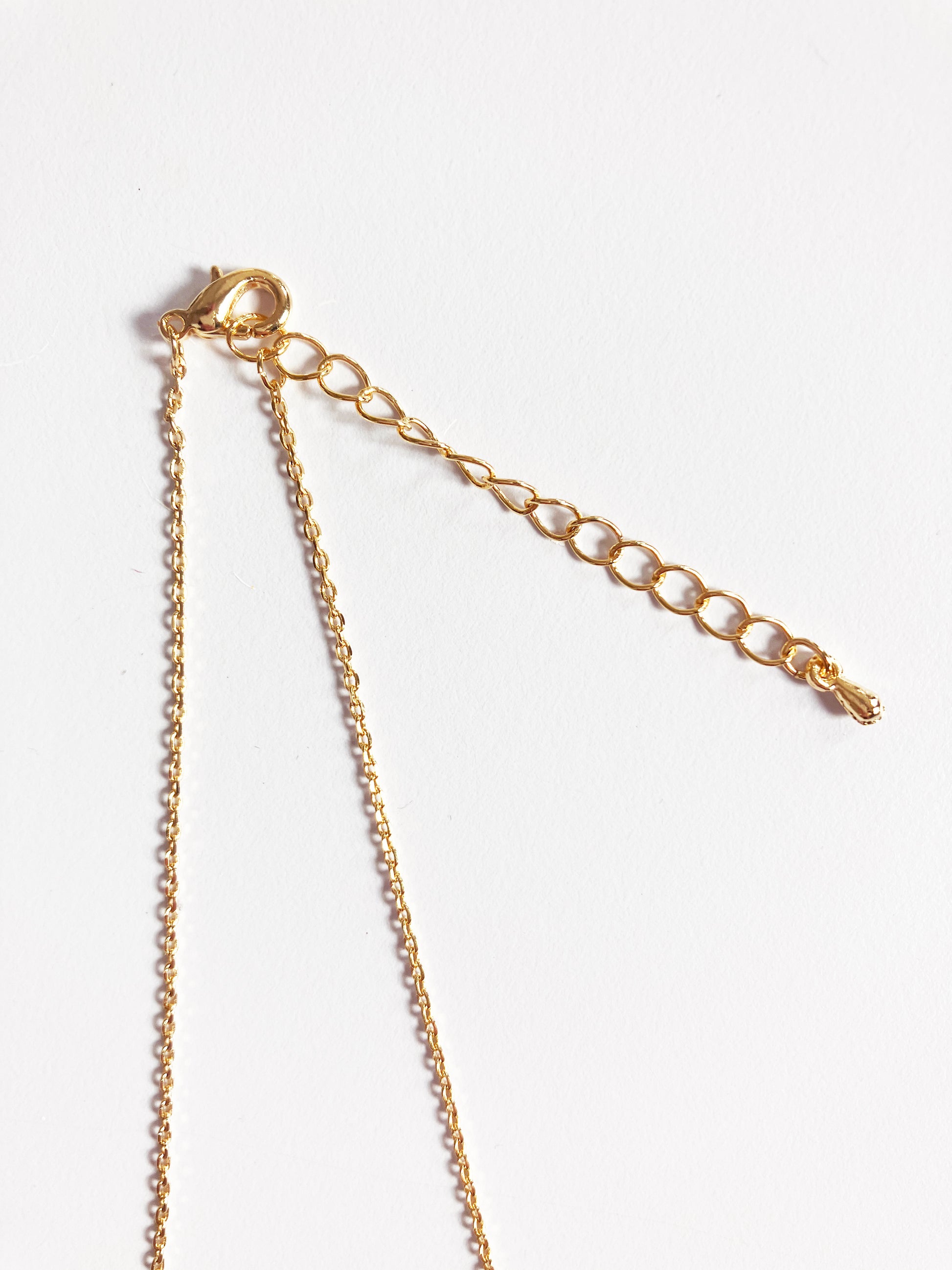 Adjustable quatrefoil motif pendant with pink mother of pearl stone set in gold plated non-tarnishing surgical steel on 15”-16” gold plated non-tarnishing surgical steel chain with a lobster clasp.