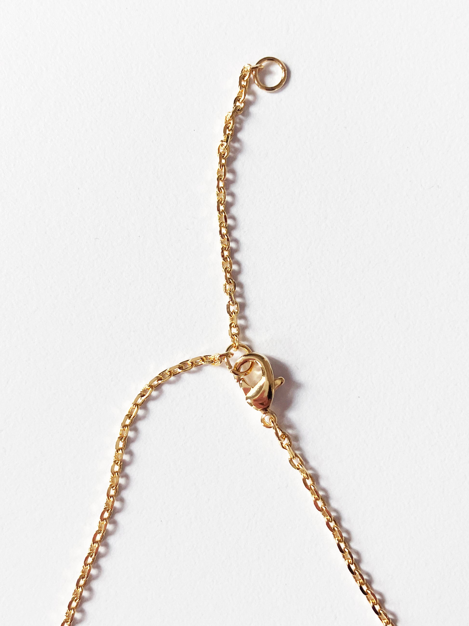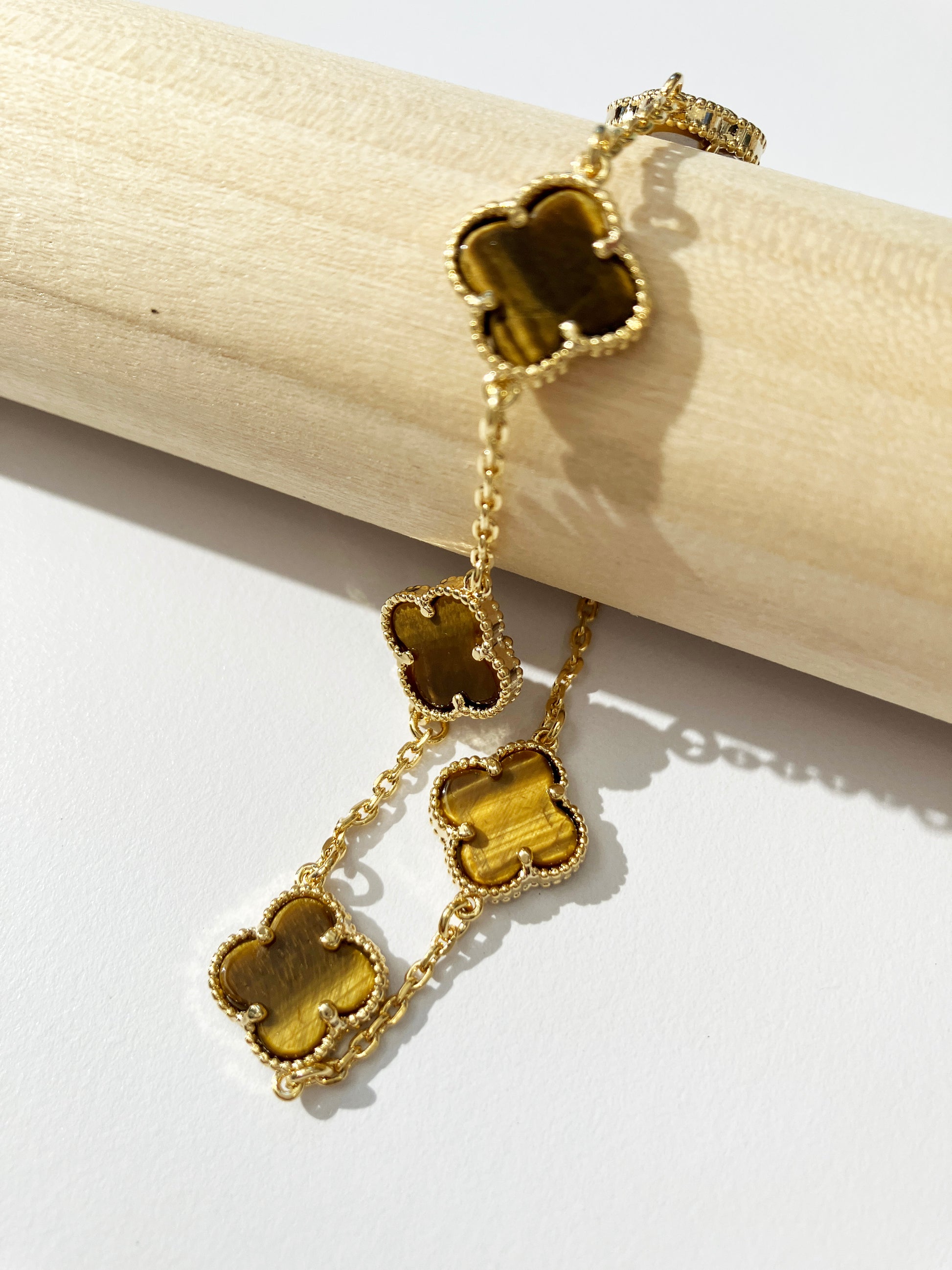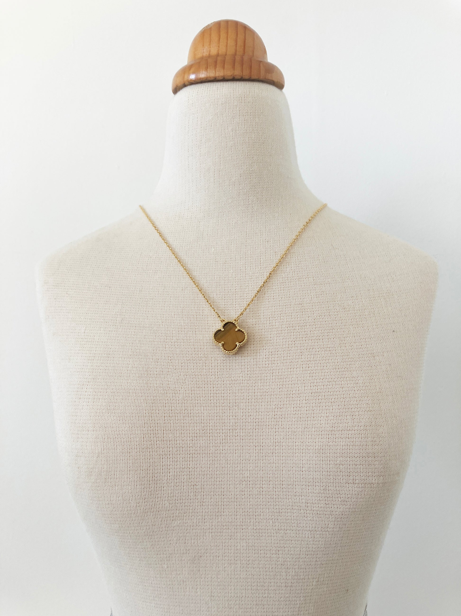 Quatrefoil Motif Pendant with tiger eye stone set in gold plated non-tarnishing surgical steel on 14”-15” gold plated non-tarnishing surgical steel chain with a lobster clasp.