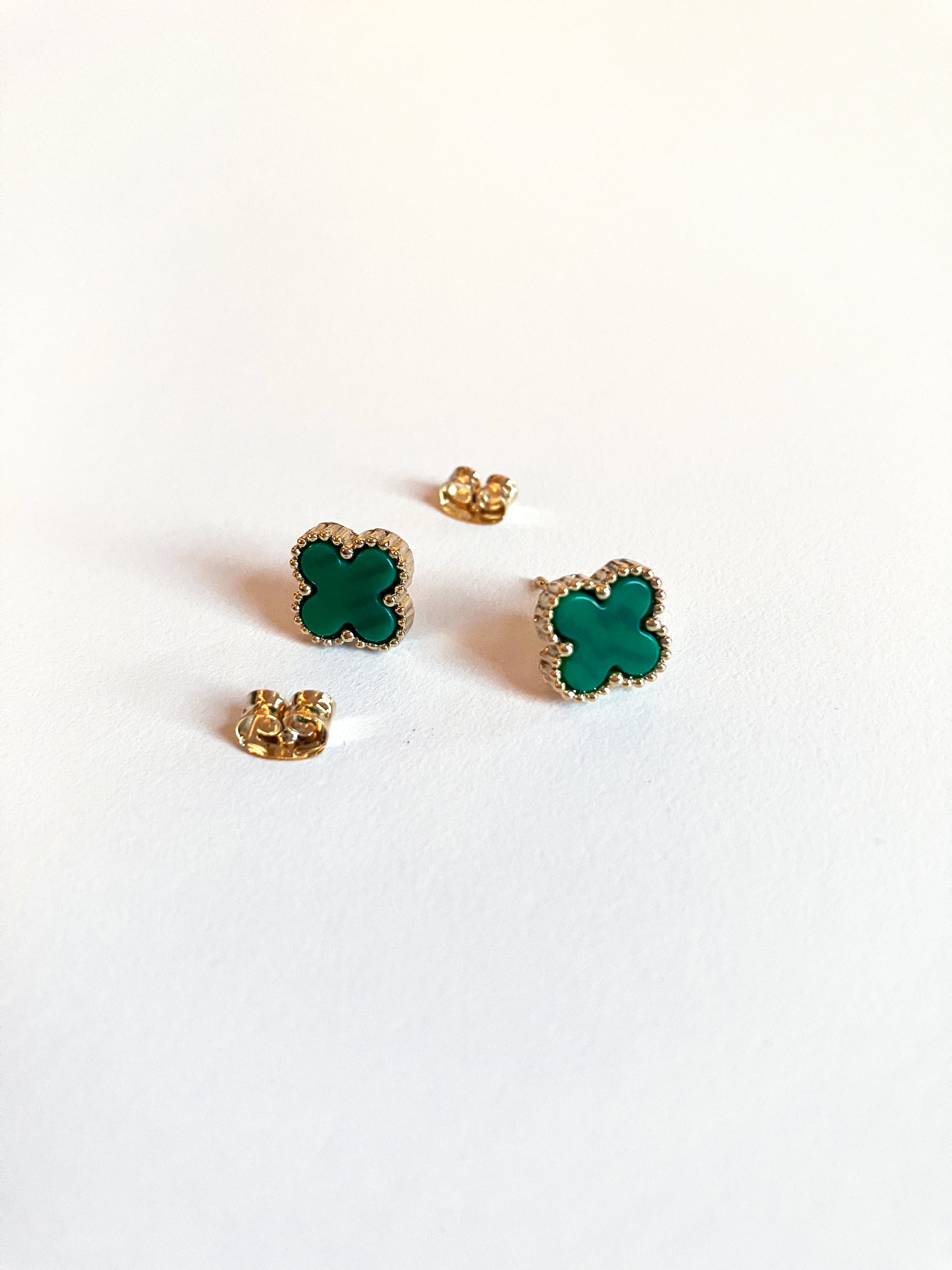 Bijou quatrefoil motif malachite stud-back earrings with butterfly back in gold plated non-tarnishing surgical steel.