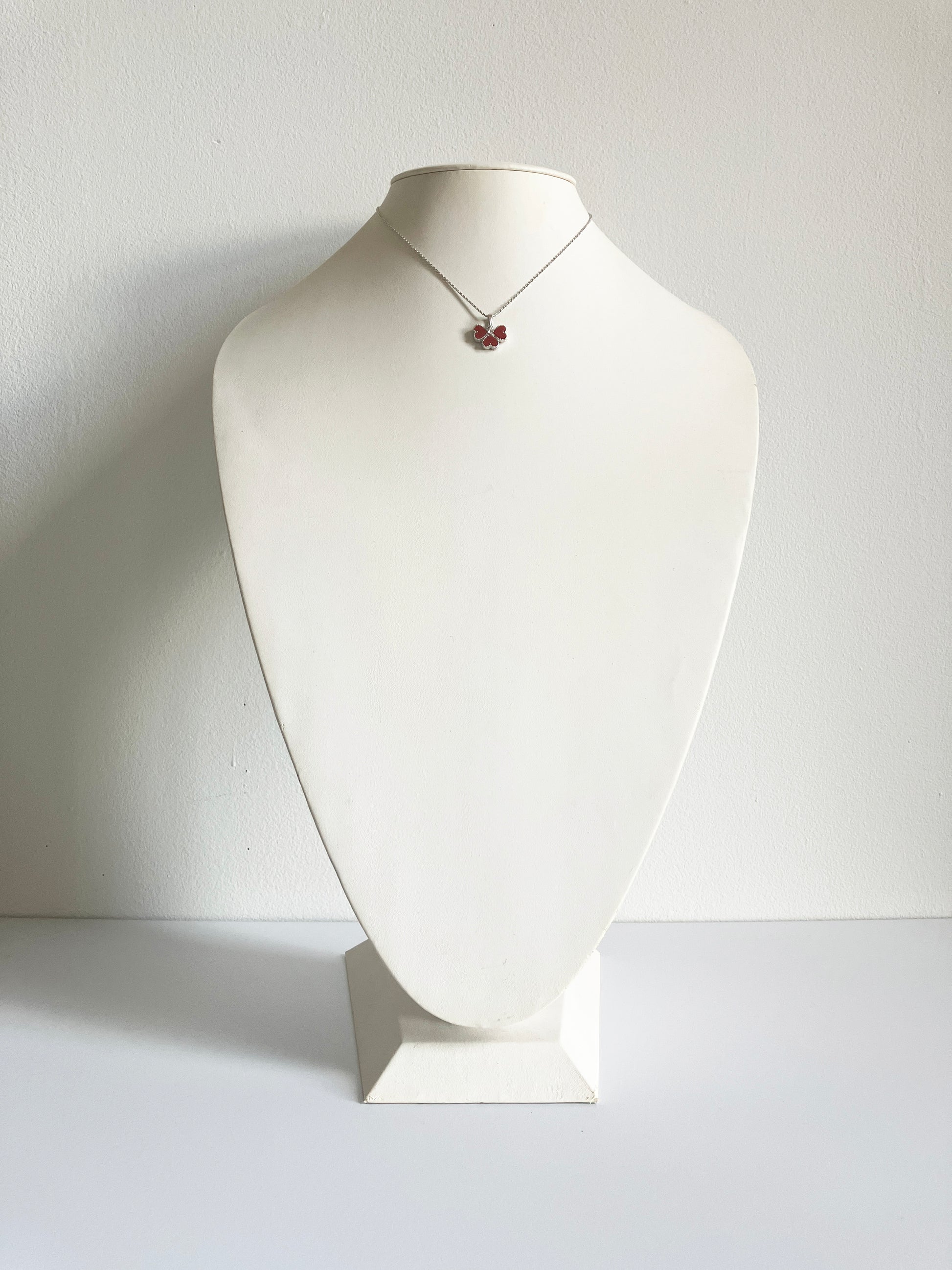 Stunning carnelian and cubic zirconia clover on a choker length silver plated non-tarnishing surgical steel chain with lobster clasp.