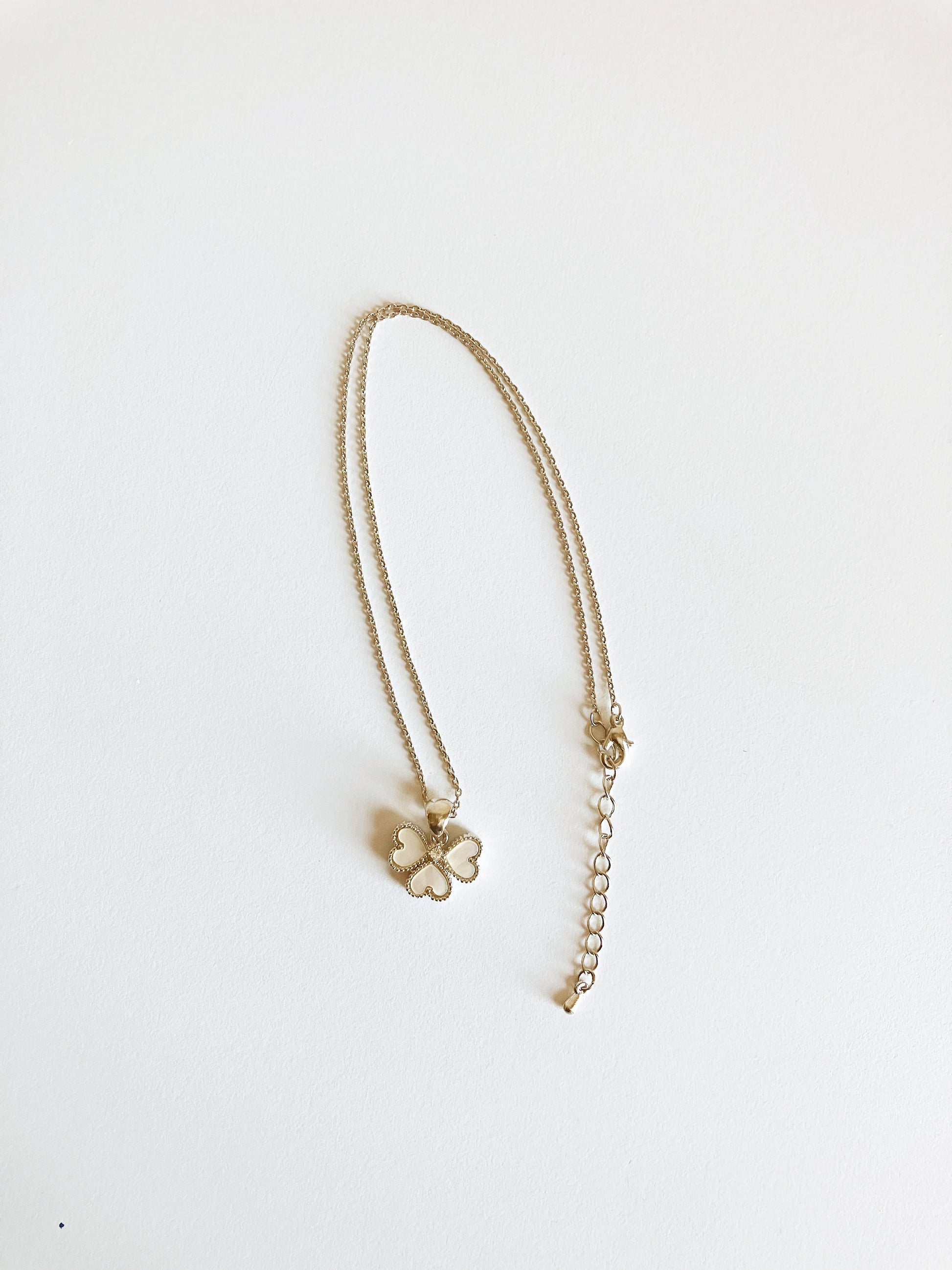 Stunning mother of pearl and cubic zirconia clover on a choker length silver plated non-tarnishing surgical steel chain with lobster clasp.