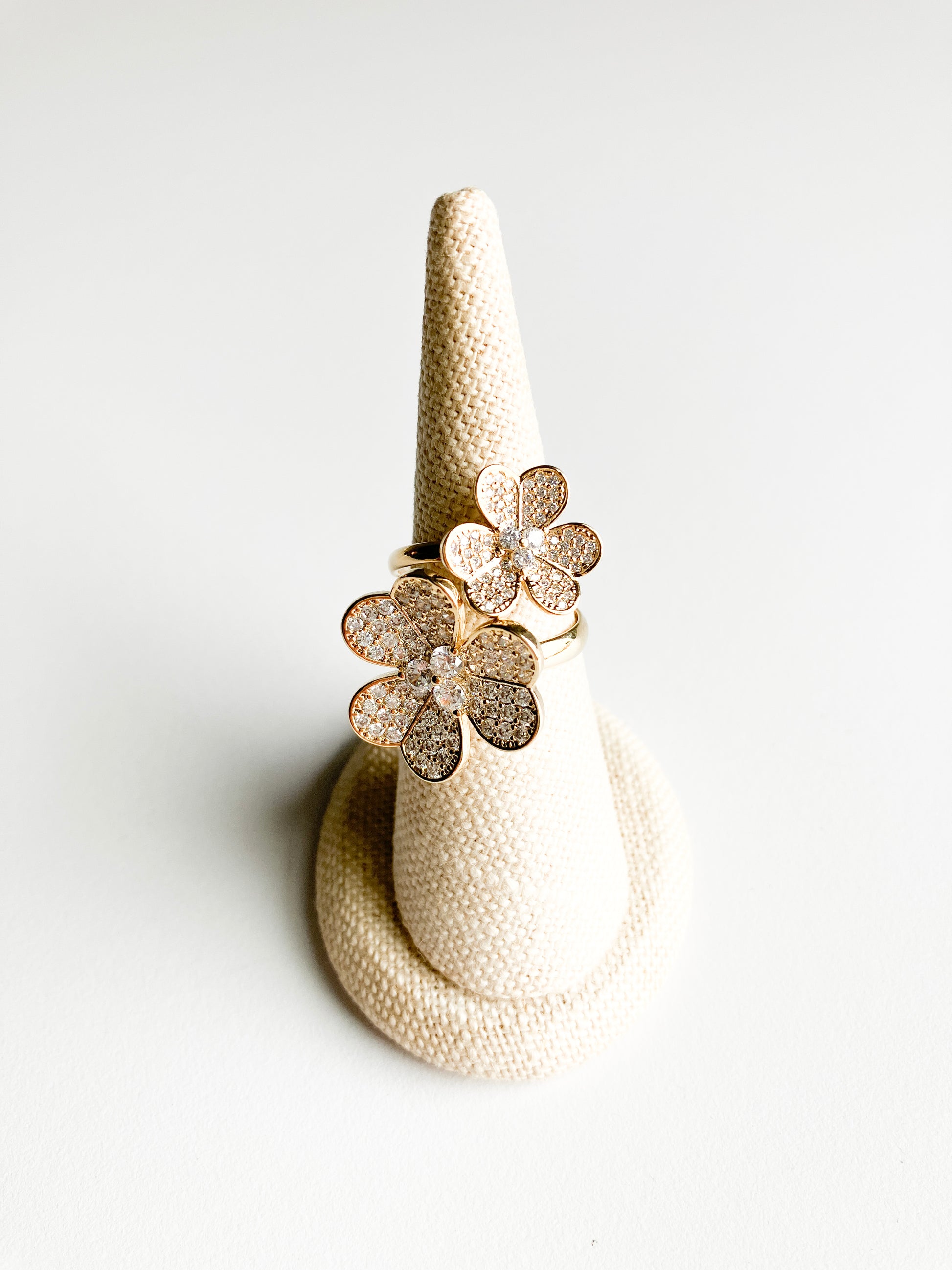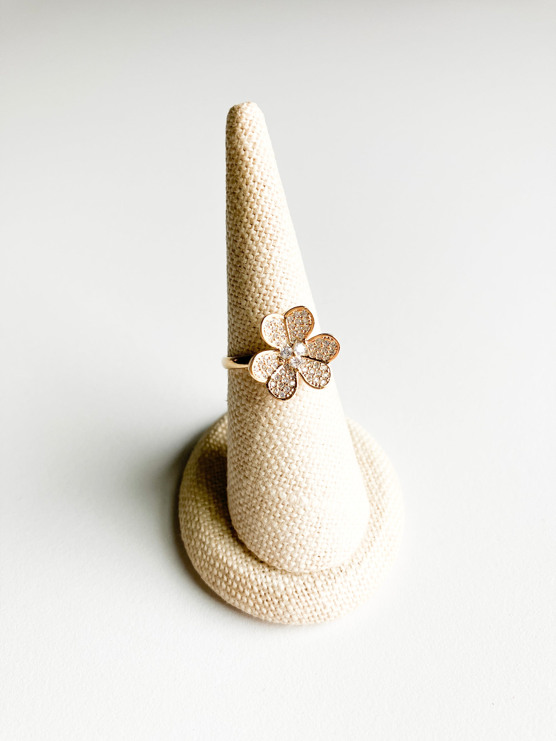 This delicate clover motif ring features sparkling cubic zirconia set in gold plated non-tarnishing surgical steel with an adjustable band. Layer with the Cubic Zirconia Clover Ring in Gold when you're in a maximalist mood.