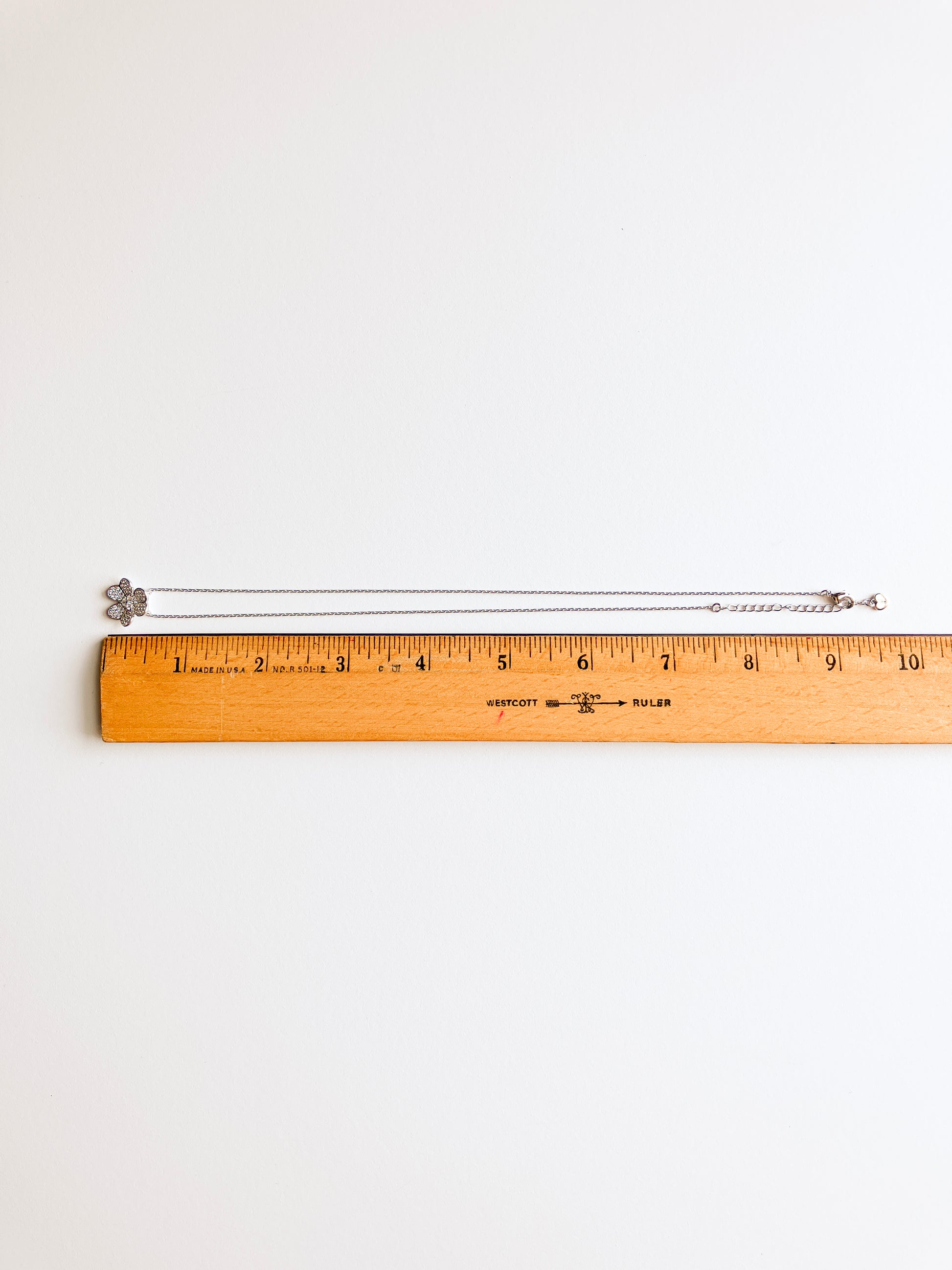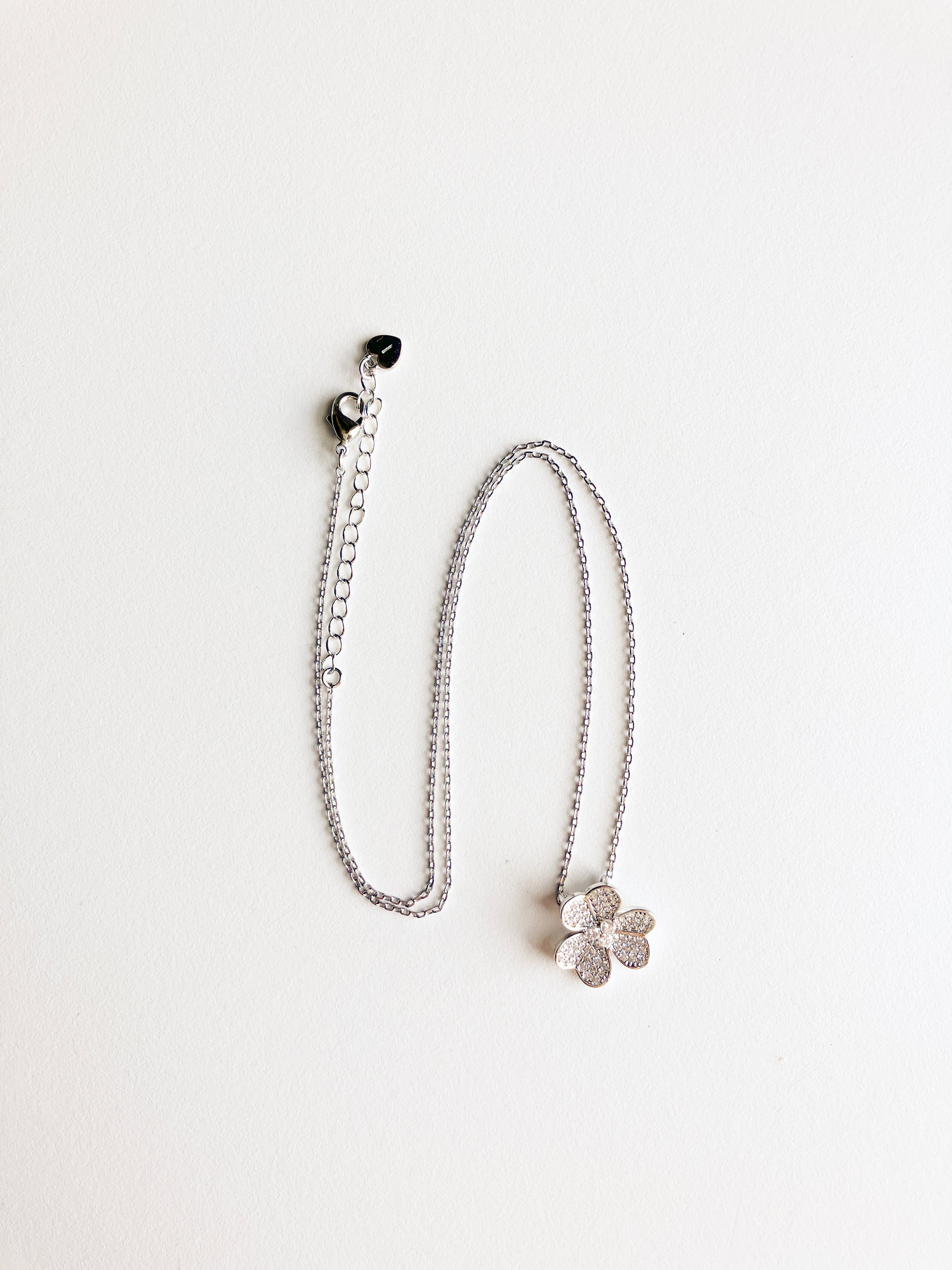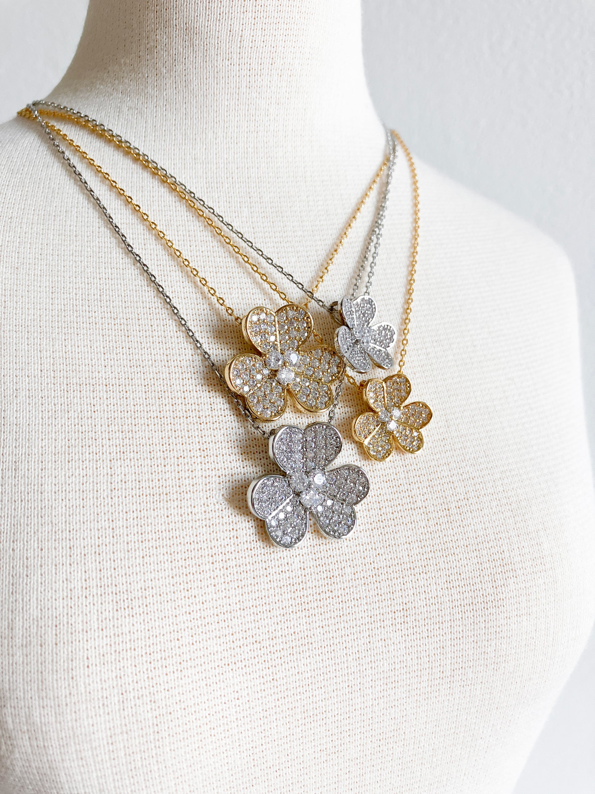 This charming clover motif pendant features shimmering pave set cubic zirconia in silver plated surgical steel on adjustable princess length chain with lobster clasp of the same composition. Finish the look with the Cubic Zirconium Small Clover Earrings in Silver, the Cubic Zirconia Small Clover Ring in Silver, or both!