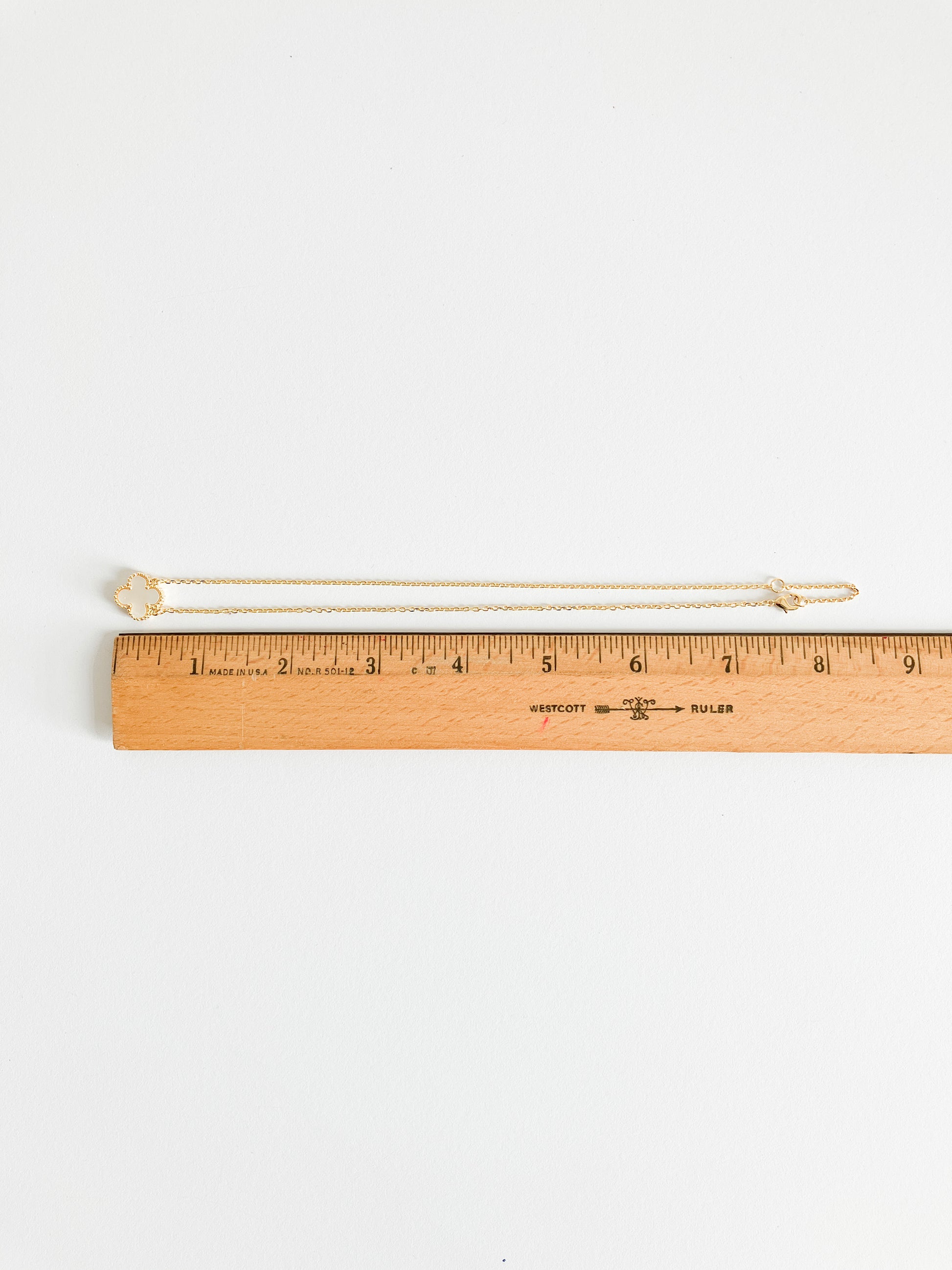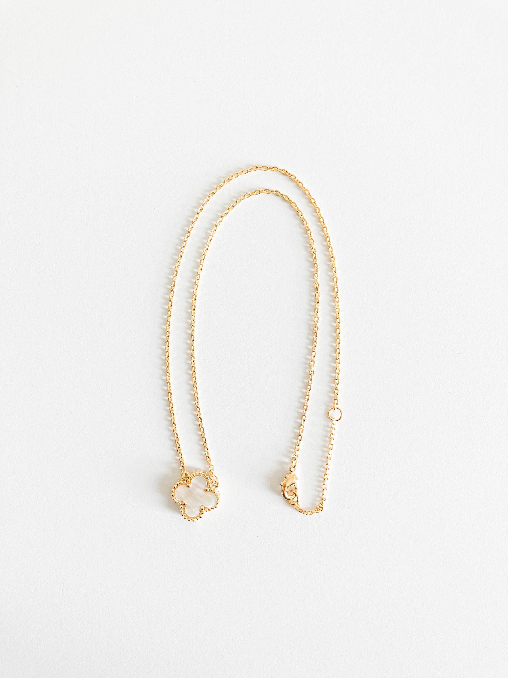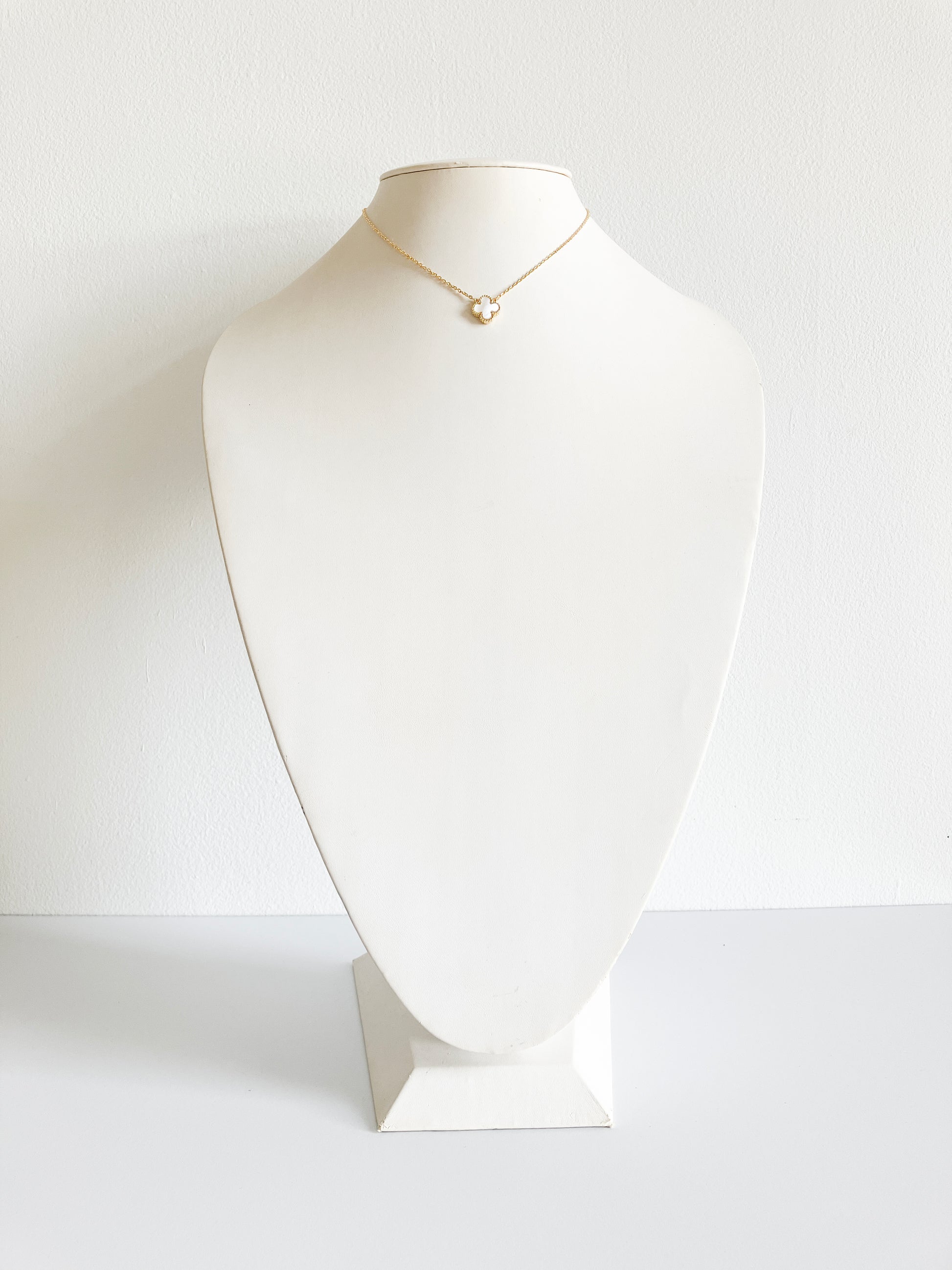 Quatrefoil motif pendant with mother of pearl stone set in gold plated non-tarnishing surgical steel on 16” gold plated non-tarnishing surgical steel chain with a lobster clasp. Just statement enough.