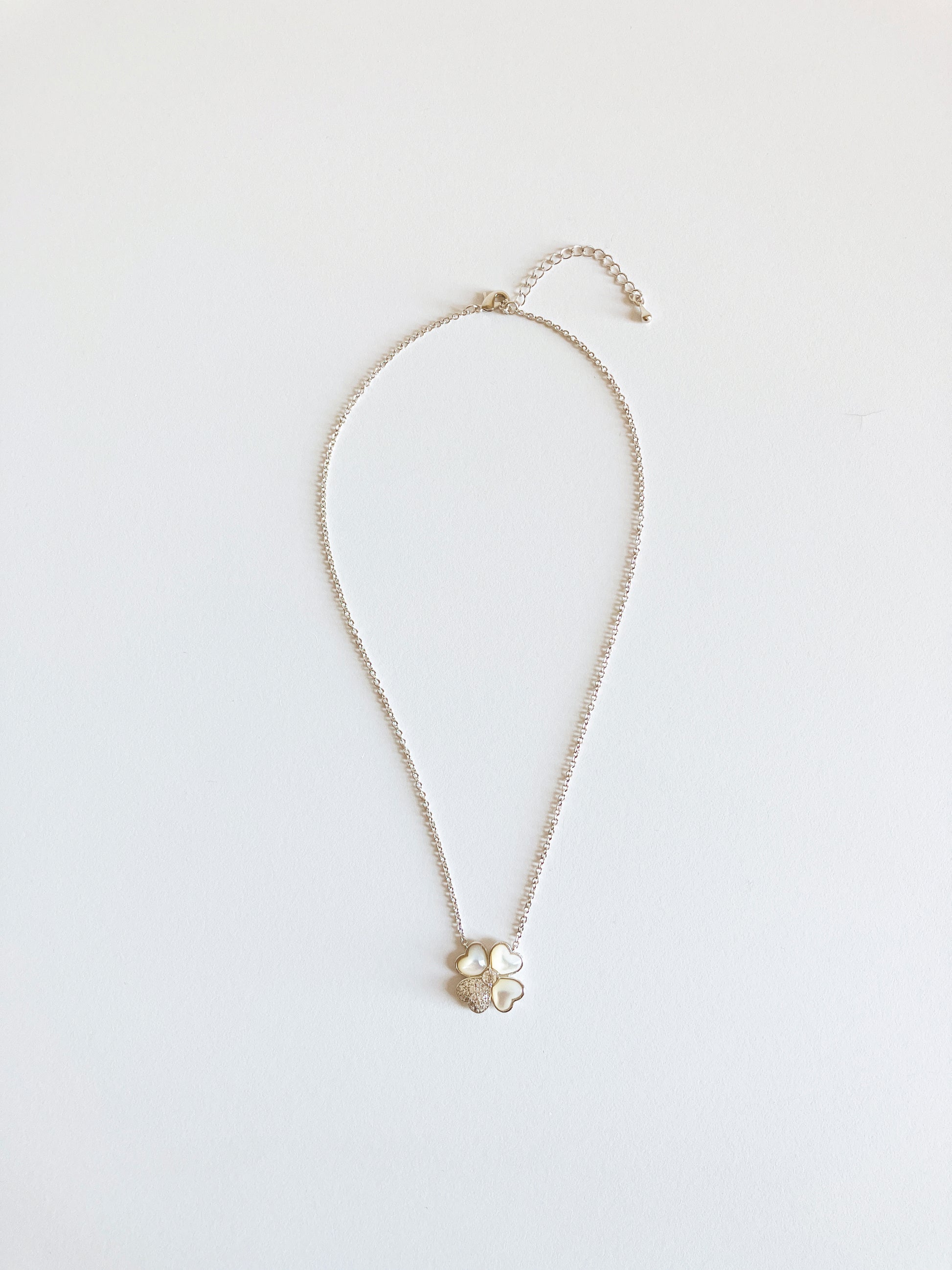 A four leaf clover fashioned out of mother of pearl and cubic zirconia on a choker length silver plated non-tarnishing surgical steel chain with lobster clasp.