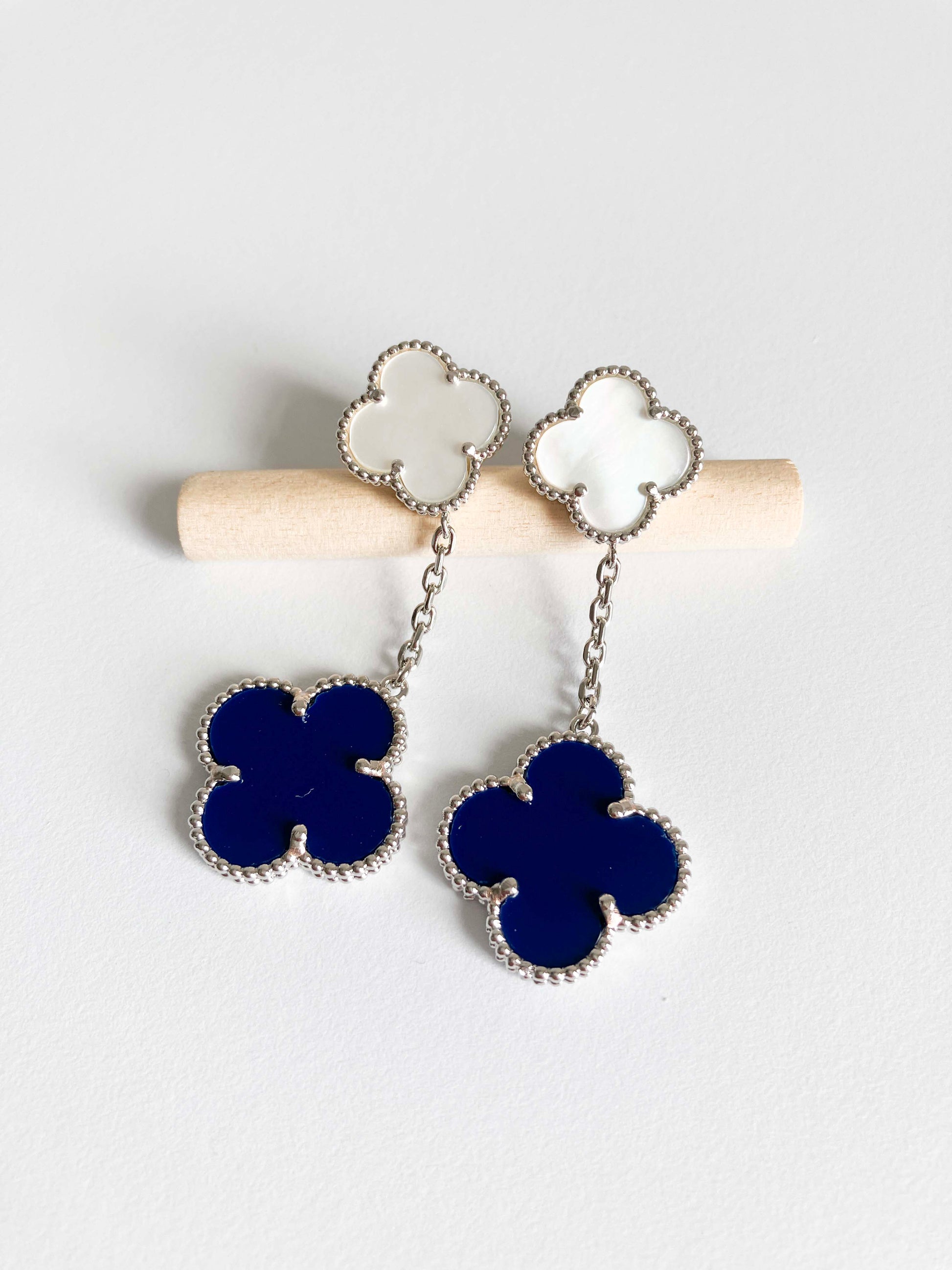 These lapis lazuli and mother of pearl double drop quatrefoil motif earrings in silver plated surgical steel with pearlage detailing and post and butterfly back are positively are a timeless classic.