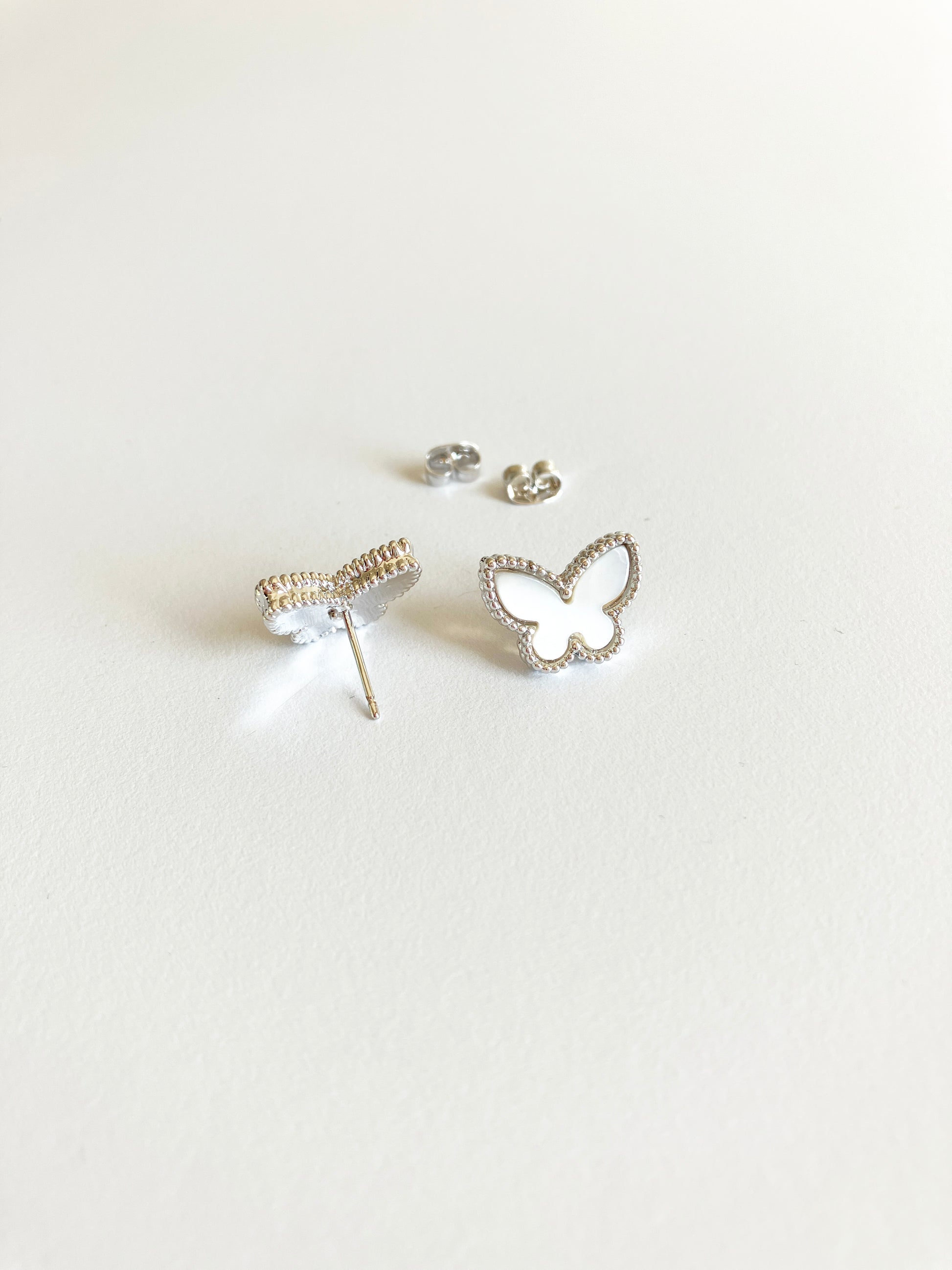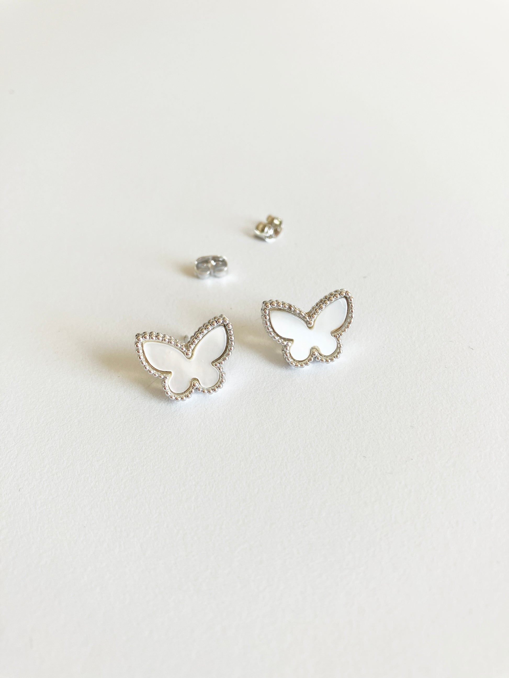 Mother of pearl butterflies set in silver plated non-tarnishing surgical steel. Timeless.