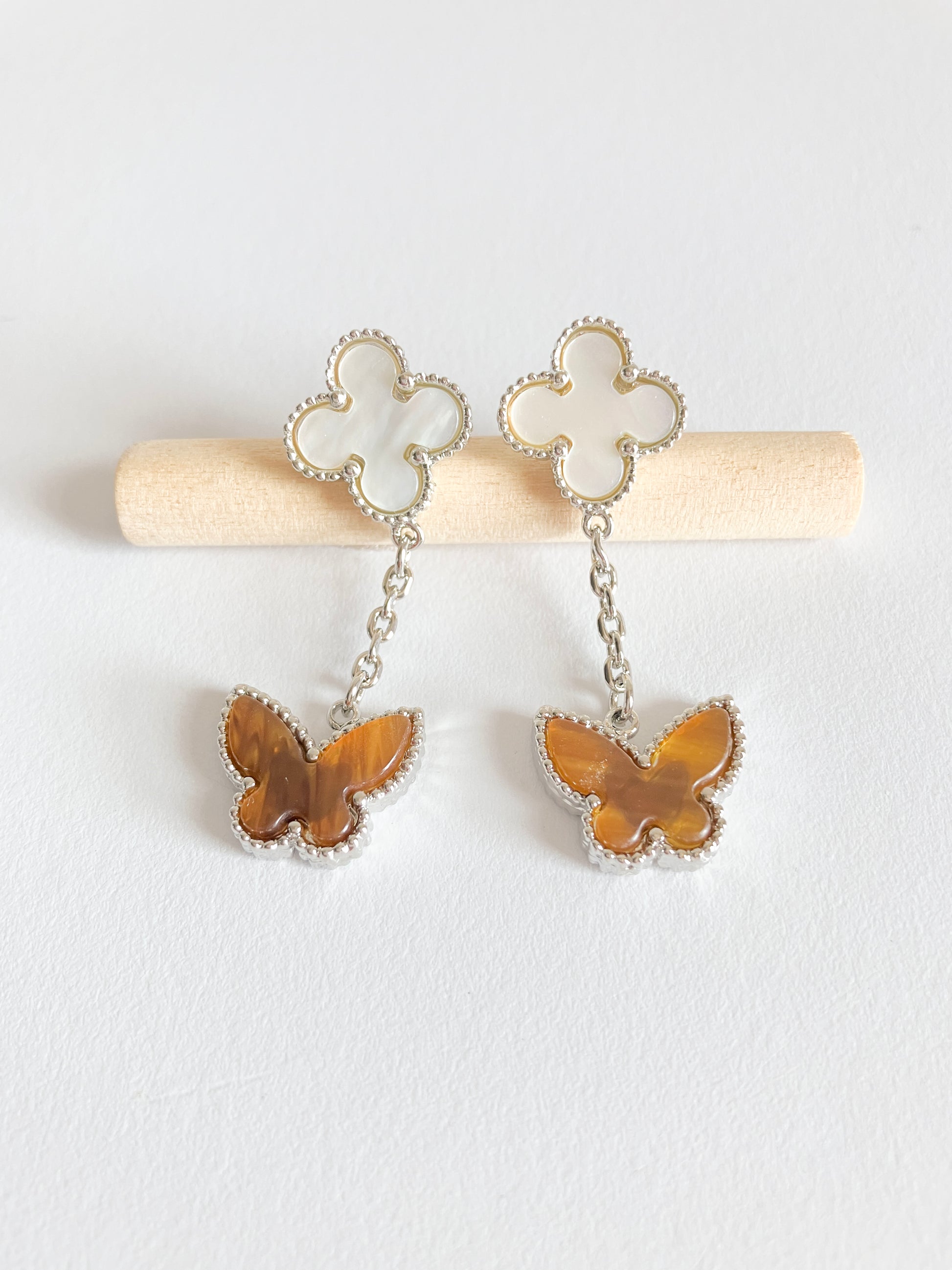 Mother of pearl quatrefoil and amber butterfly motif drop earrings in silver plated non-tarnishing surgical steel with butterfly backs. These versatile stunners blend warm and cool neutrals seamlessly.