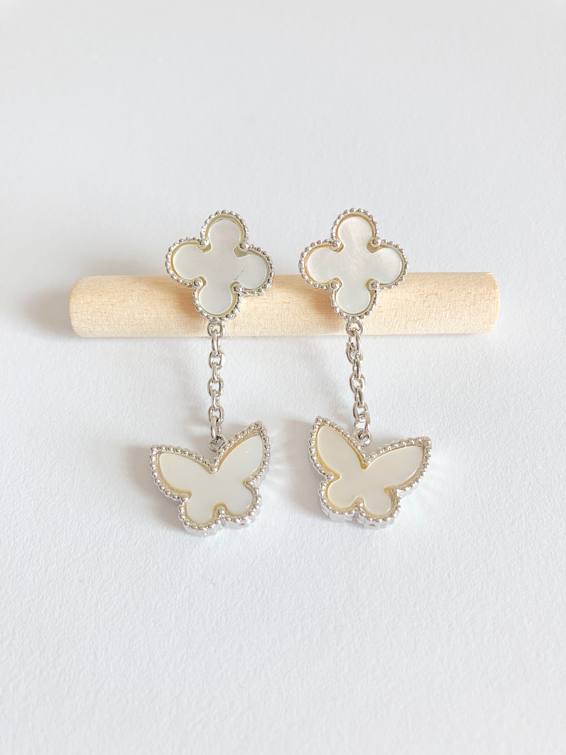Mother of Pearl Quatrefoil and Butterfly Drop Earrings in Silver