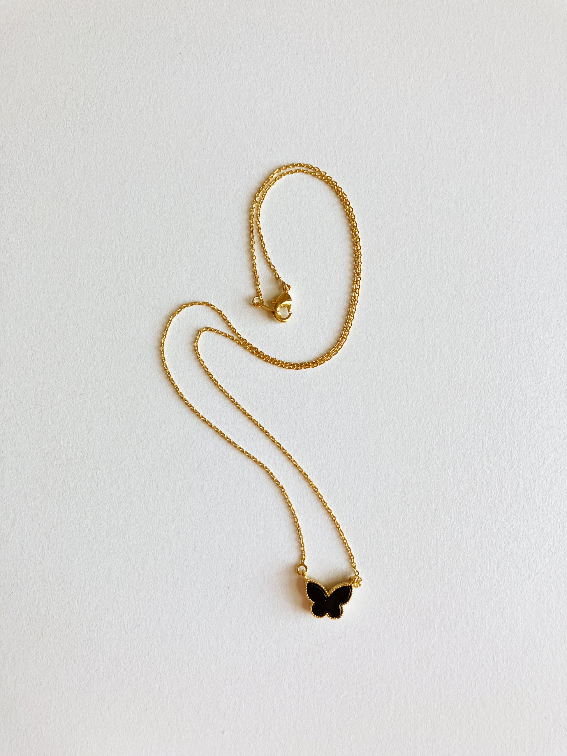 Adjustable 16" onyx butterfly motif necklace in gold plated non-tarnishing surgical steel with lobster clasp. Onyx. Every day. Every night.