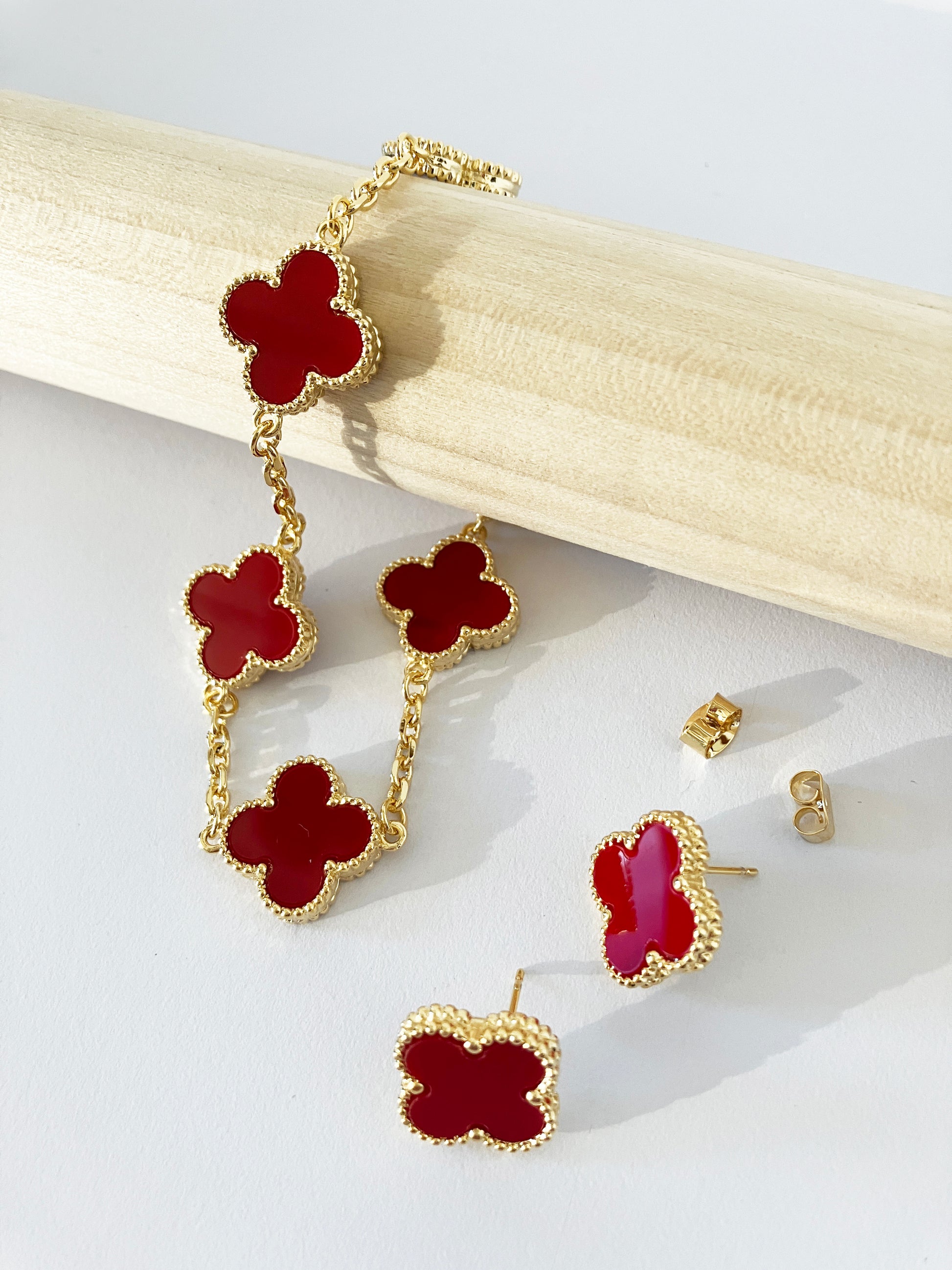 Treat yourself or a loved one with this beautiful demi parure of adjustable gold plated non-tarnishing surgical steel bracelet and stud earrings set with quatrefoil shaped carnelian stone. Valued at $75 and $45 when sold separately.