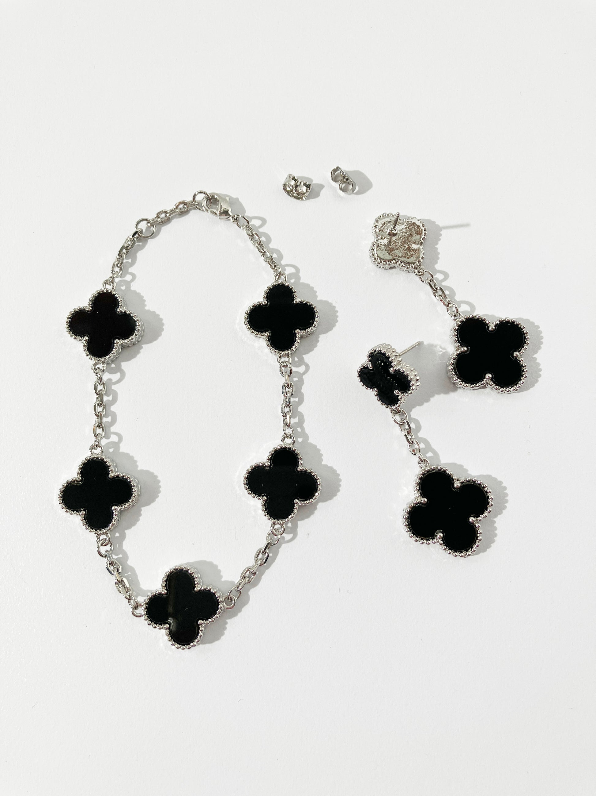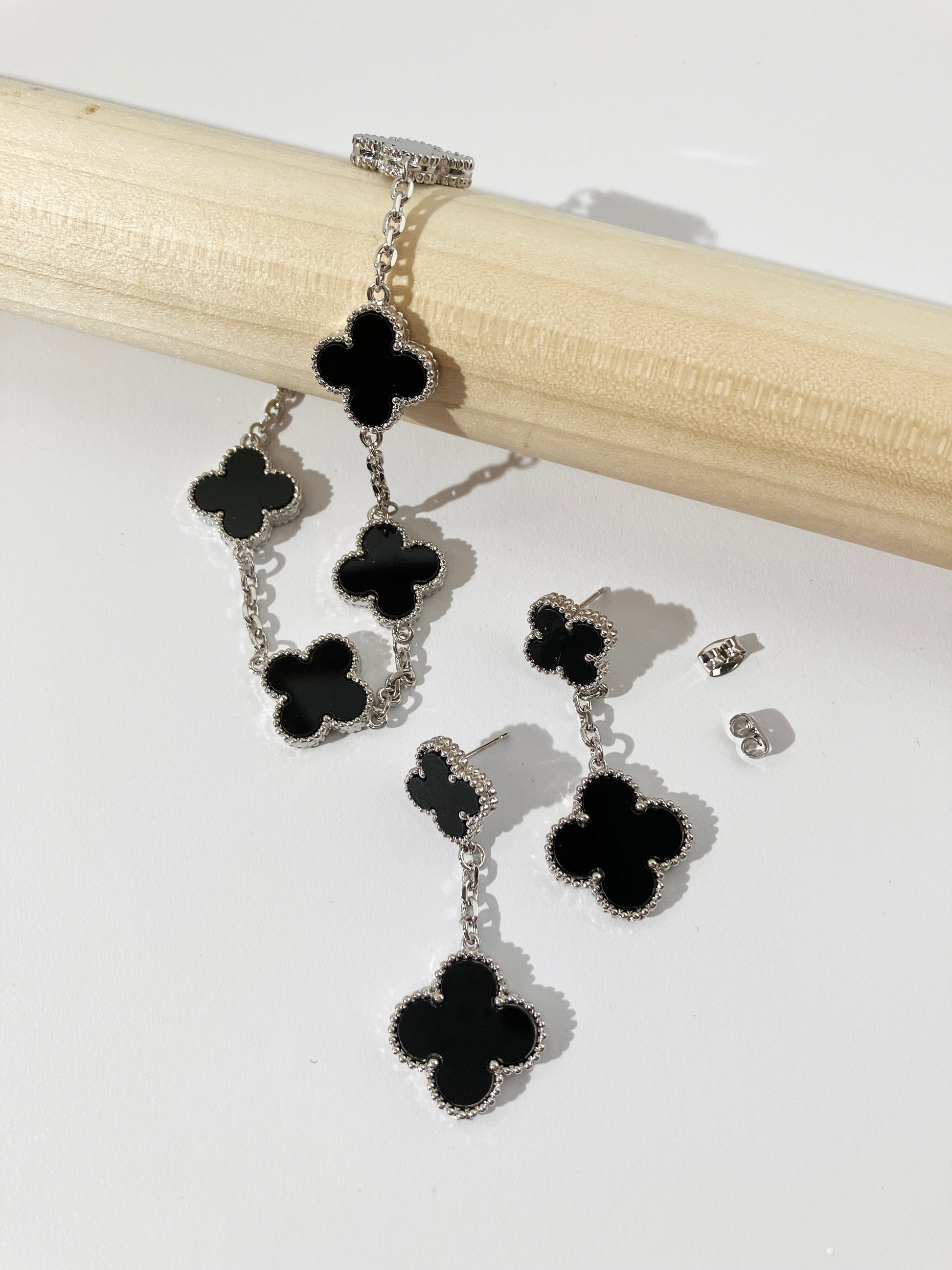 Treat yourself or a loved one with this beautiful demi parure of adjustable silver plated non-tarnishing surgical steel bracelet and double-hanging earrings set with quatrefoil shaped onyx stone. Valued at $75 and $55 respectively when sold separately.
